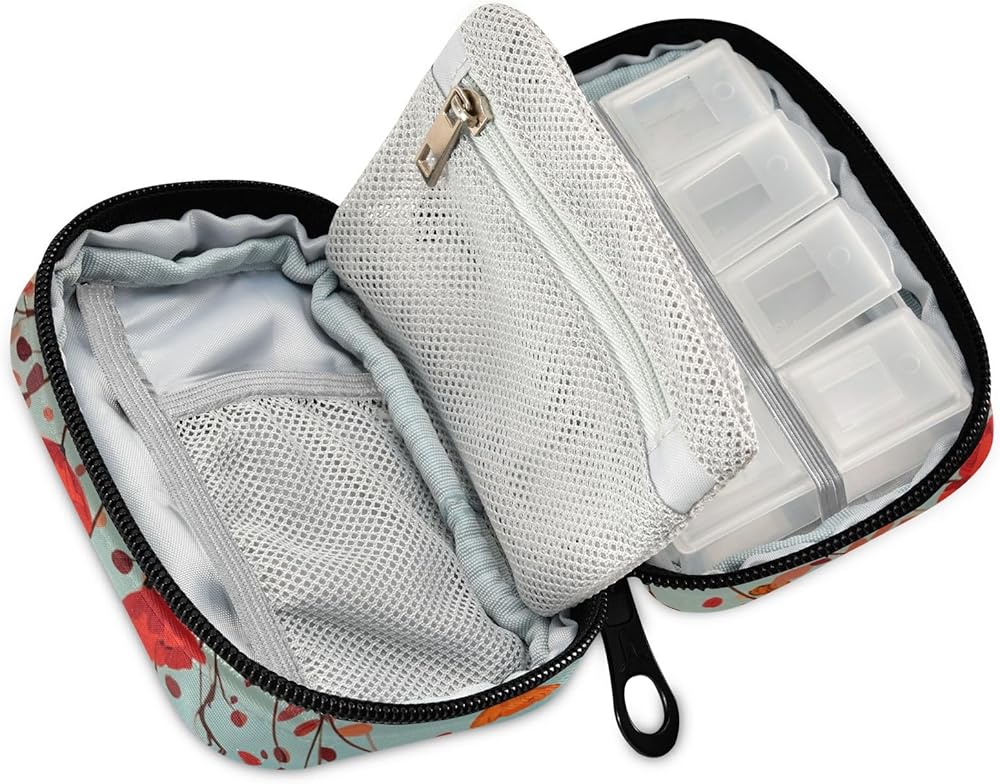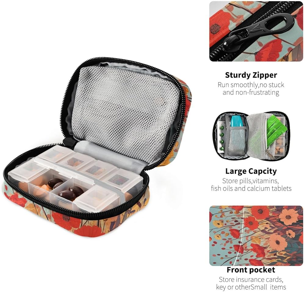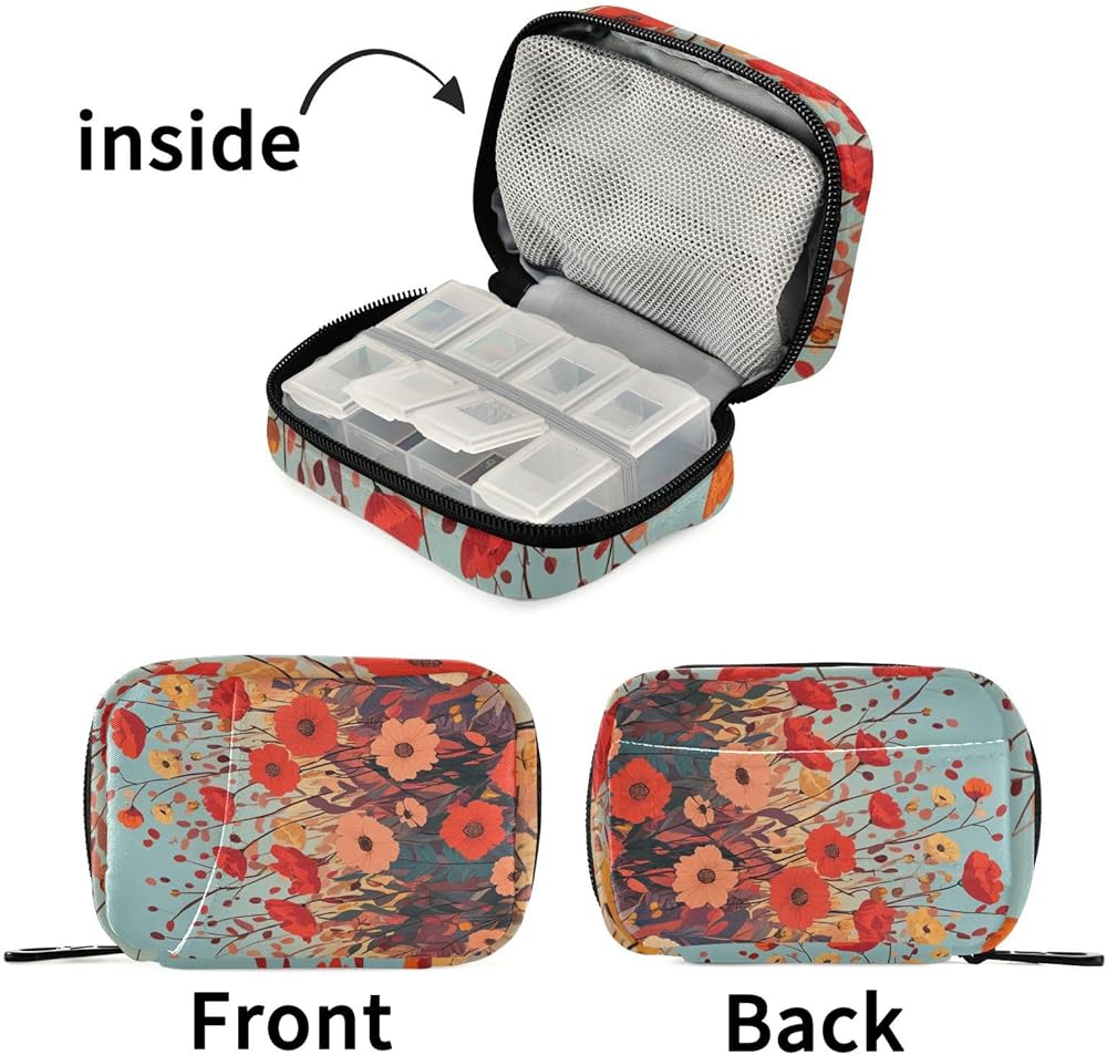 سهل تنظيم حبوب الدواء: يتمتع منظم حبوب الدواء اللطيف بسعة كبيرة. تحتوي علبة الأقراص الصغيرة على 8 مديري أقراص بلاستيكية يسهل فتحها وإغلاقها بأمان، ولن تسقط الحبوب. يوجد شريط مطاطي لحمل صندوق الدواء البلاستيكي. عندما تفتح صندوق الدواء القماشي، فإنه لن ينزلق للأسفل. بالإضافة إلى ذلك، يمكن لمنظم حبوب السفر أيضًا وضع ضمادات الإسعافات الأولية وحوالي 50 مل من المطهرات، إلخ