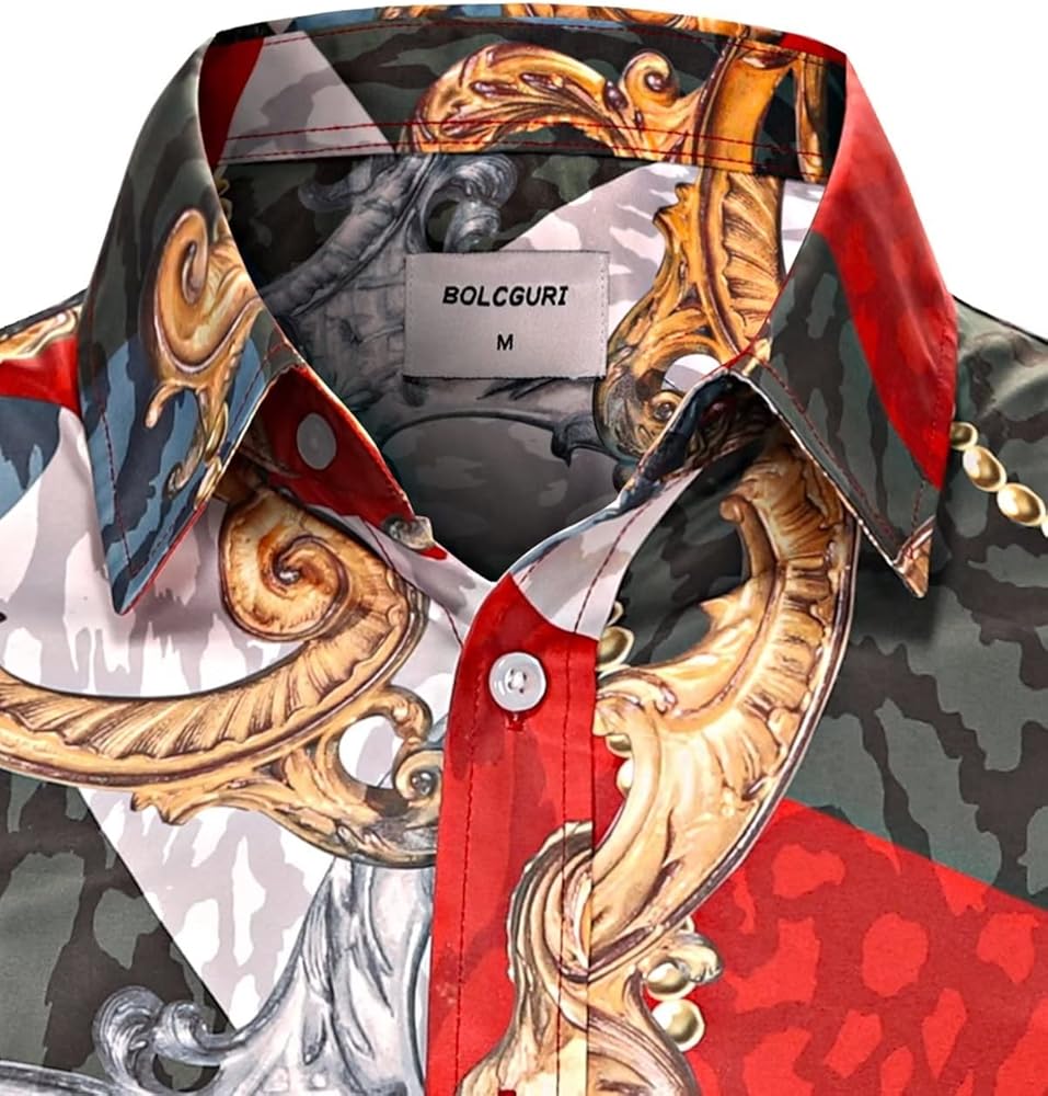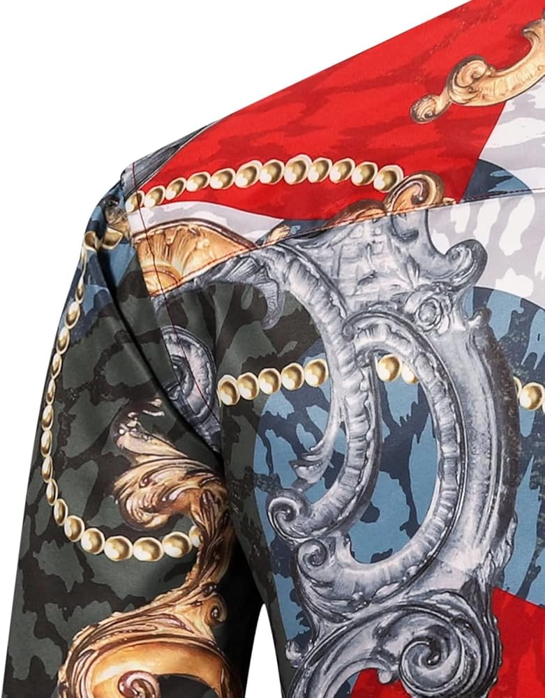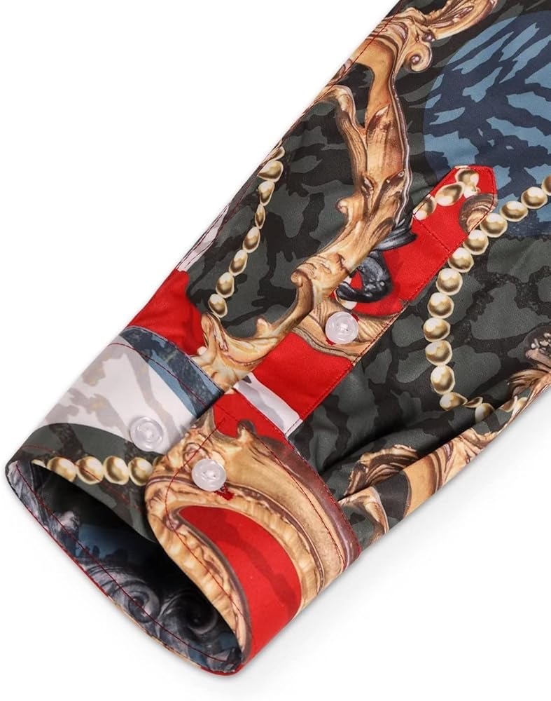 【أنماط من المصممين الإيطاليين】: قمصان الباروك الكلاسيكية تتميز بمظهر فاخر ولون عصري نابض بالحياة. يتميز قميص الفستان باللونين الأسود والذهبي بطباعة نمطية شاملة مع سلاسل ذهبية وسوداء، تتوافق مع نمط الحبل الأبيض، والكشكشة الذهبية، والنمط الأحمر لمظهر فاخر.
