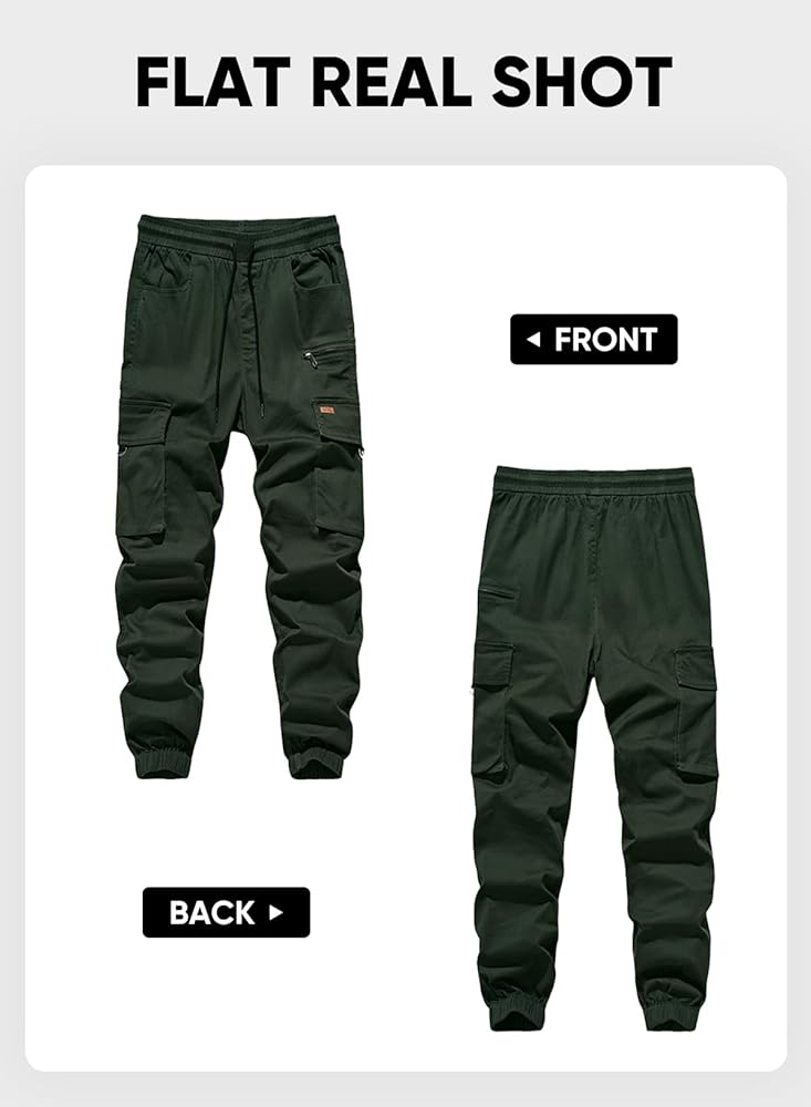 • Product Features: These cargo pants feature an elastic waistband with a drawstring for adjustable comfort. The elastic cuffs add to the overall relaxed fit. Equipped with five front pockets, including one with a zipper, these pants provide ample storage options. (The design does not include back pockets.)
