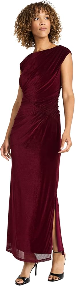 Elegant maxi dress, long dress, and wedding guest dress featuring a fitted silhouette with cap sleeves, boat neckline, ruched side detailing, and subtle side slit. Crafted from soft, drapey fabric with luxurious sheen for a stunning cocktail dress look.