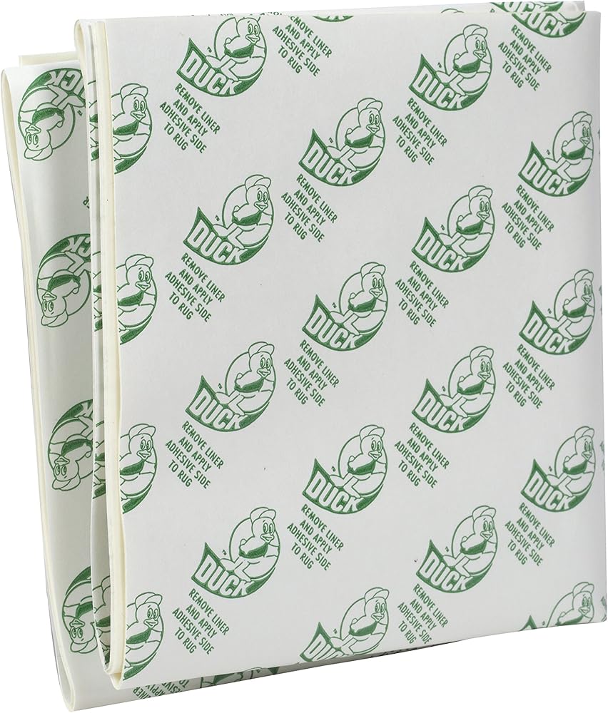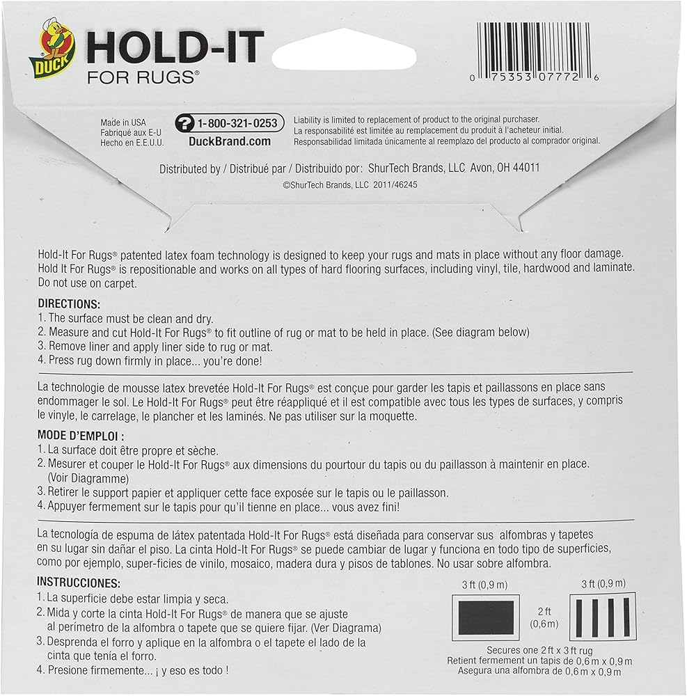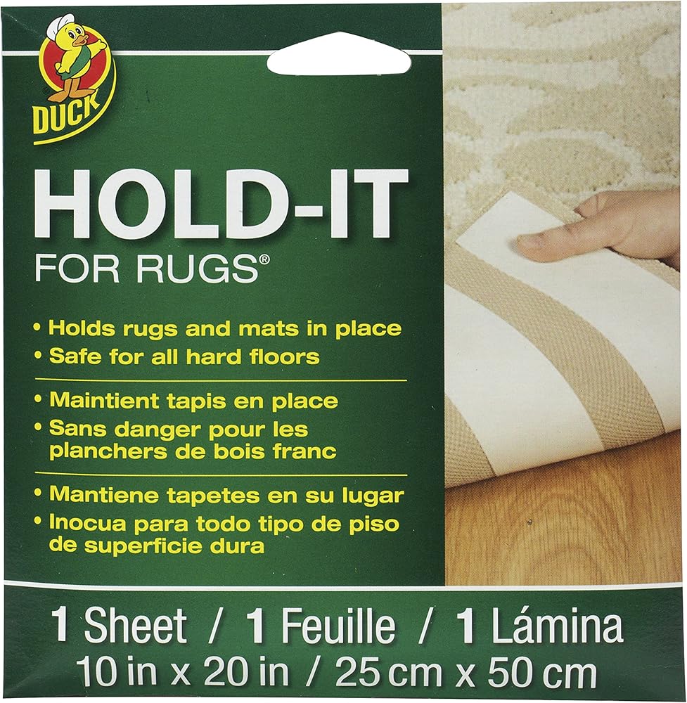 Looking to keep carpets, rugs and floor mats from slipping, bunching and moving out of place? Duck Brand Hold It For Rugs is a simple solution to keeping your things in place without damaging what's underneath. It features a patented non-slip latex foam coated with an adhesive backing on only one side. This is not double sided tape. Hold-It For Rugs is repositionable and works on most types of flooring surfaces including vinyl, tile, hardwood and laminate. The non-slip material may not grip well to some finishes or surfaces. Do not use this product if putting a rug or mat down on top of existing carpeting. Since the foam side is going down on top of your flooring (the adhesive side bonds to the rug or mat) it will not leave an adhesive residue behind like some double-sided tapes would. The 10-by-20 inch sheet can be cut to size for maximum holding power and one sheet is recommended for mats up to 2-by-3-feet. INSTALLATION INSTRUCTIONS: 1. Floor surface must be clean and dry. 2. Measure and cut "Hold-It for Rugs" to fit the outline of the rug or mat being held in place. 3. Remove to release liner from the foam and apply the exposed liner side to the rug or mat. 4. Press rug down firmly in place.