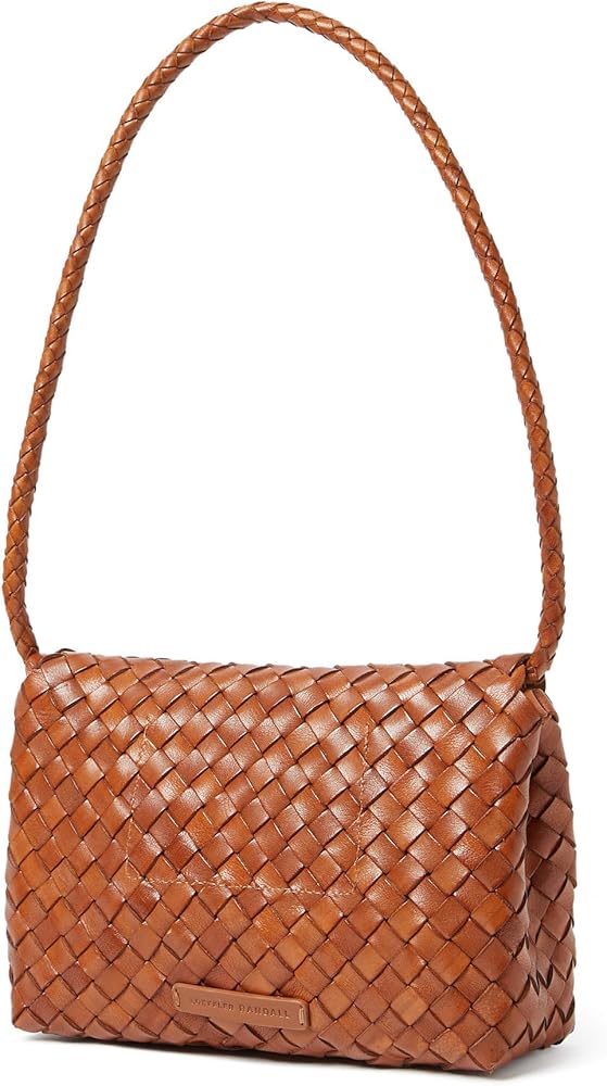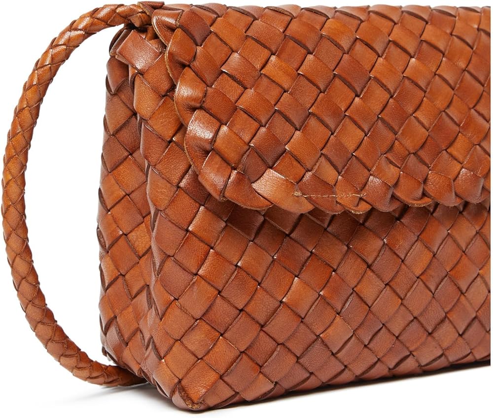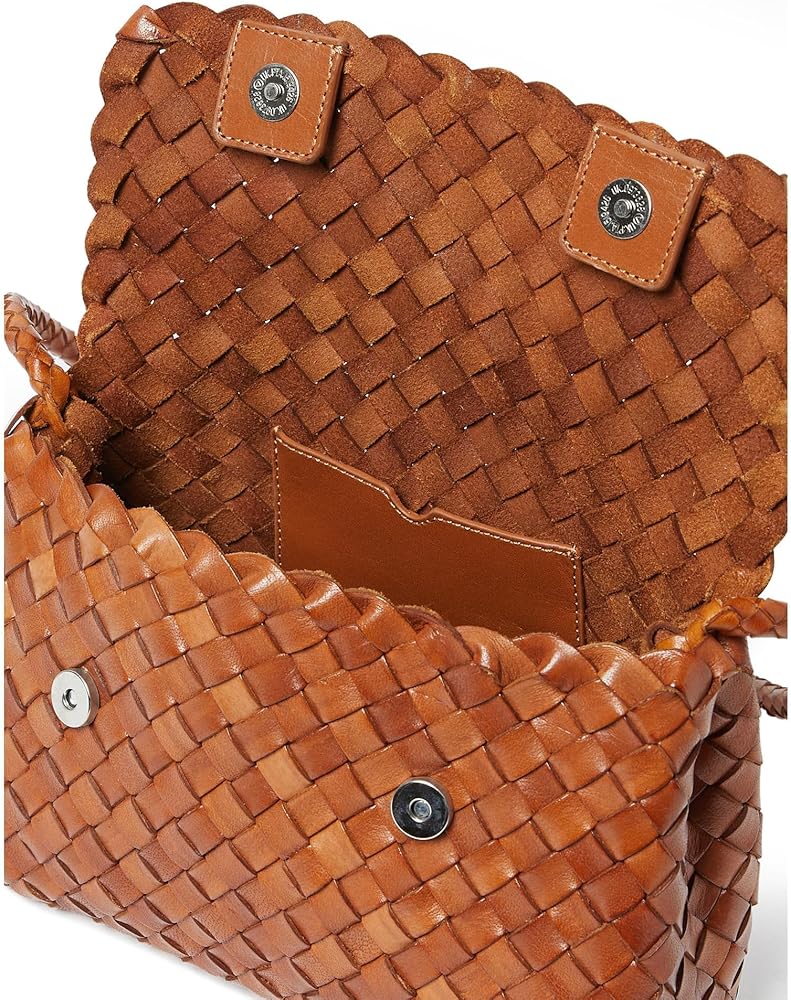 Shoulder bag in silver woven leather. Features a magnetic flap closure, blind embossed leather logo patch, and interior card slot.