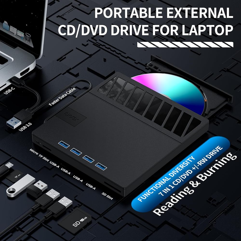 محرك أقراص CD/DVD خارجي من APPINESSEY لأجهزة الكمبيوتر المحمول، مشغل أقراص CD/DVD محمول 7 في 1 USB فائق النحافة، ذاكرة SD TF CD ROM متوافق مع مشغل DVD خارجي لأجهزة الكمبيوتر المحمول MacBook، Windows 11/10/8/7 Linux (أسود)