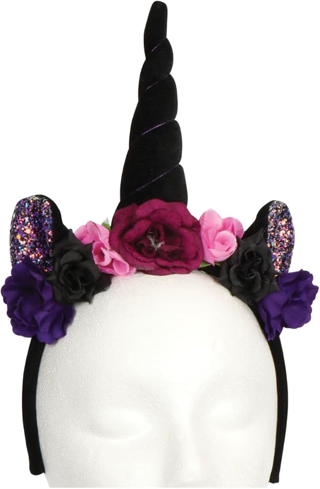 Enchanting Headpiece: Adorned with a 6 inch tall sleek black horn, shimmering faux ears, and flowers, the headband adds a touch of magic.