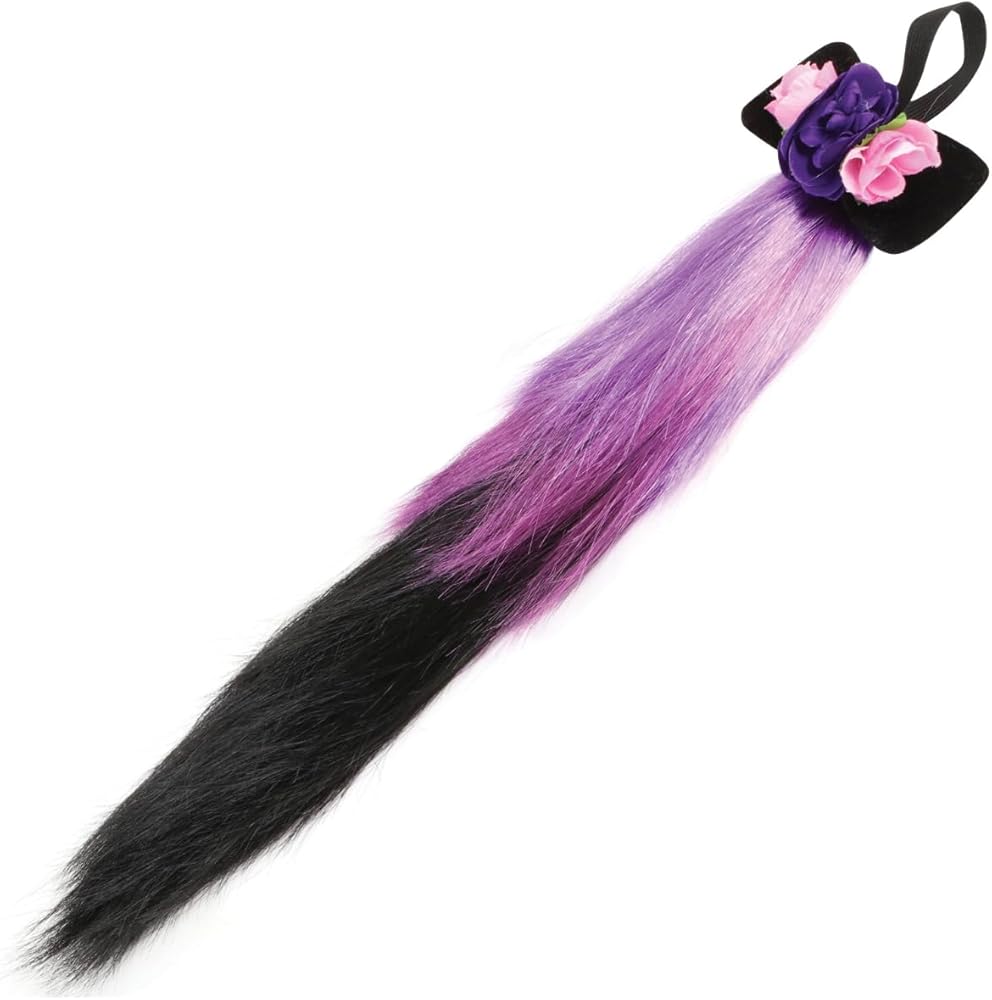 Playful Tail: Complete the ensemble with this 20 inch long black and purple tail adorned with a black bow and flowers, that attaches securely to your waistlineby an elastic hoop.