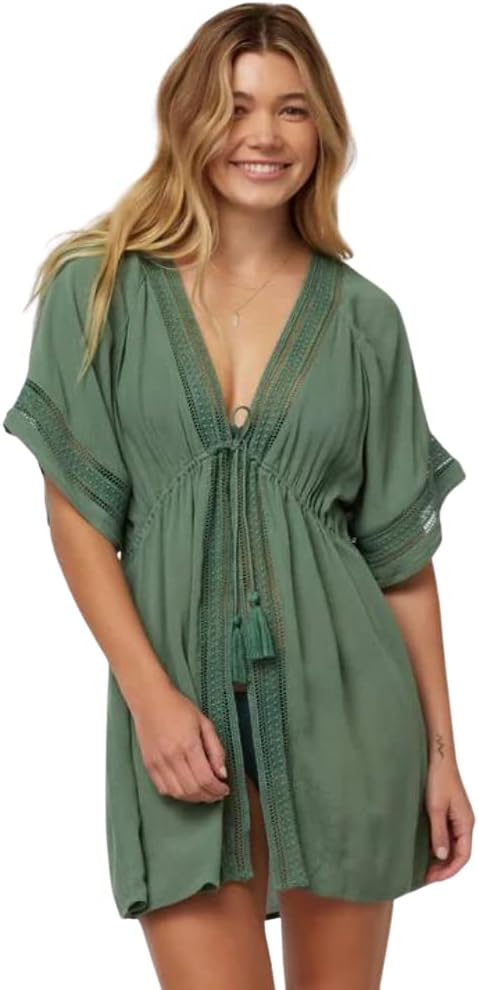 Get the sultry after-dive look wearing O'Neill Wilder cover-up dress. Crinkle gauze. Open front. Functional waist drawcord. Short sleeve design. Inset crochet. 100% viscose. Machine wash cold.