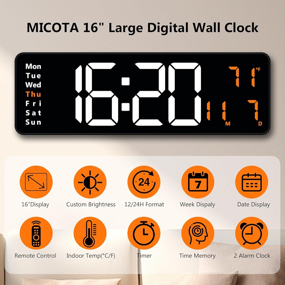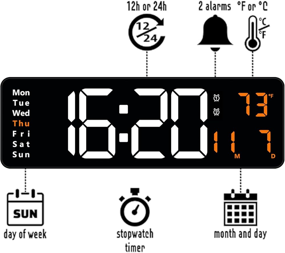 [شاشة كبيرة مقاس 16 بوصة]: العرض 15.35 بوصة، الارتفاع 5.11 بوصة، الشاشة 16 بوصة. من السهل رؤية شاشات العرض الرقمية الكبيرة من أي زاوية، حتى من مسافة بعيدة، وهي مفيدة بشكل خاص لكبار السن. ألوانه مشرقة وتضيف أيضًا لمسة من الأناقة إلى ديكور غرفتك.