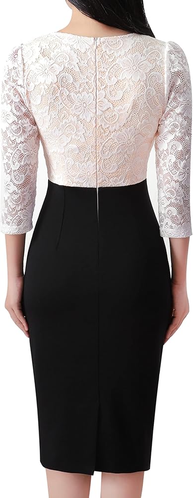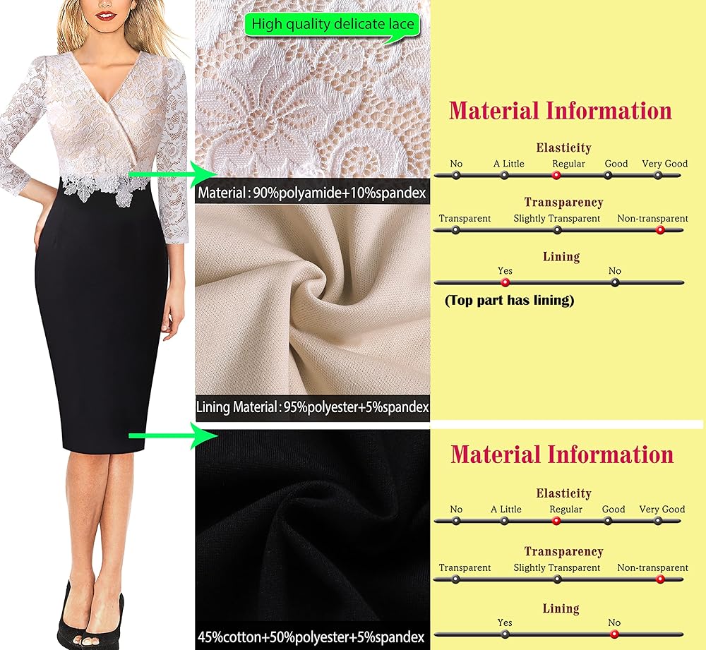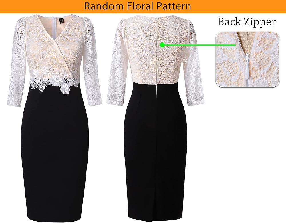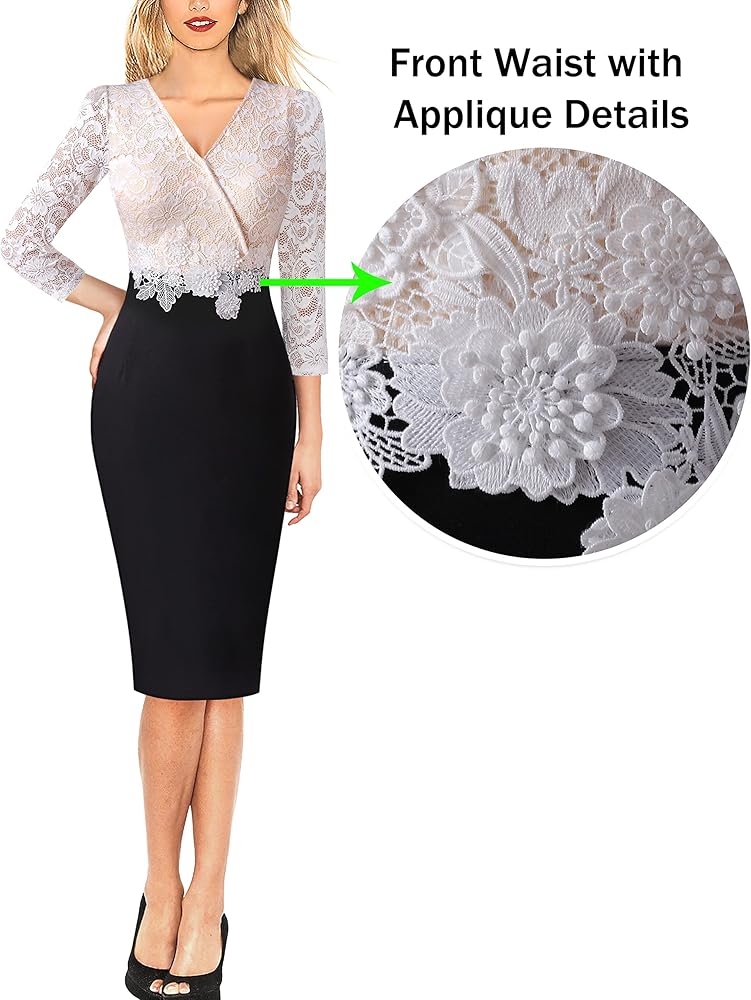 النمط: خط رقبة على شكل حرف V، أكمام 3/4 شفافة، دانتيل زهور، تفاصيل خصر مزخرفة ثلاثية الأبعاد، تصميم مرقع، مقاس تنحيف، صورة ظلية غمد، سحاب خلفي مخفي، فتحة خلفية لسهولة المشي.