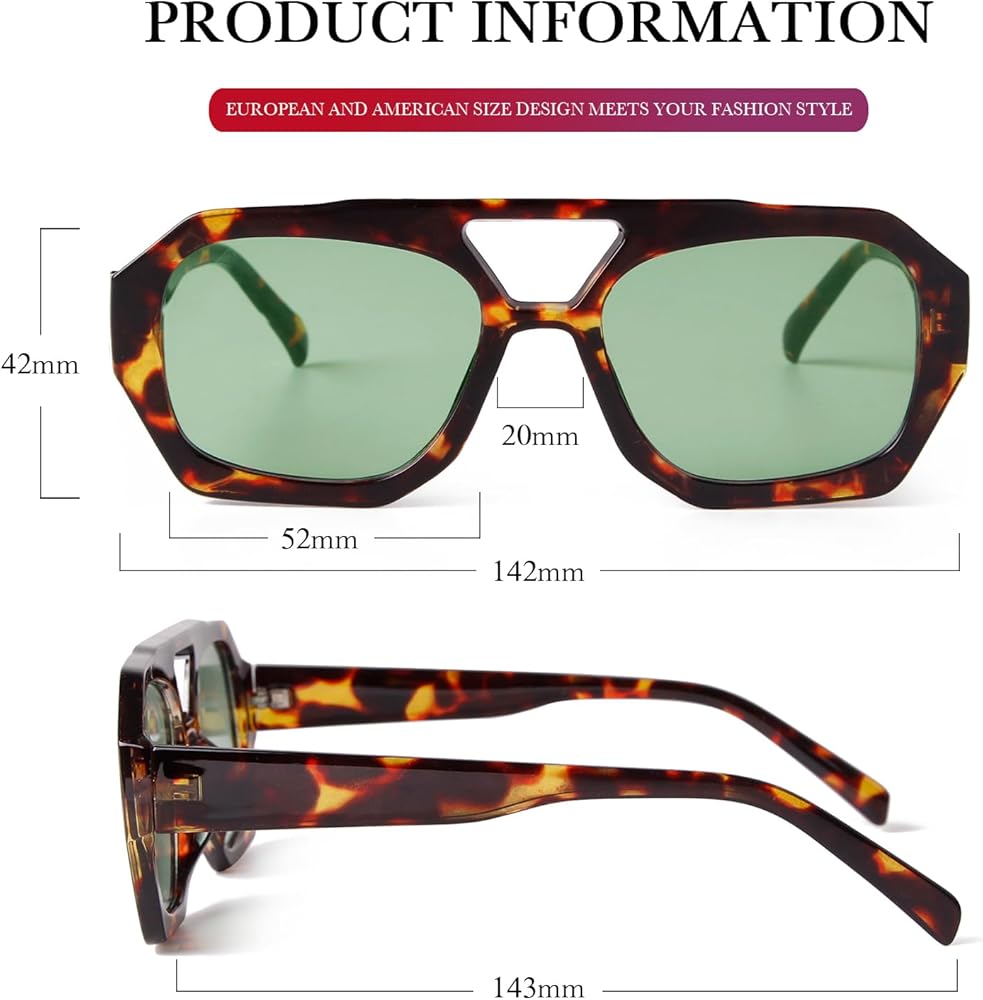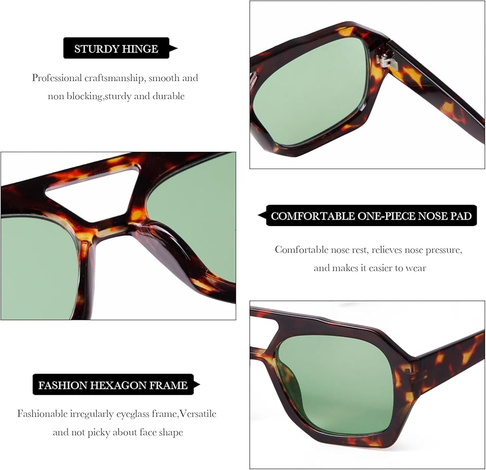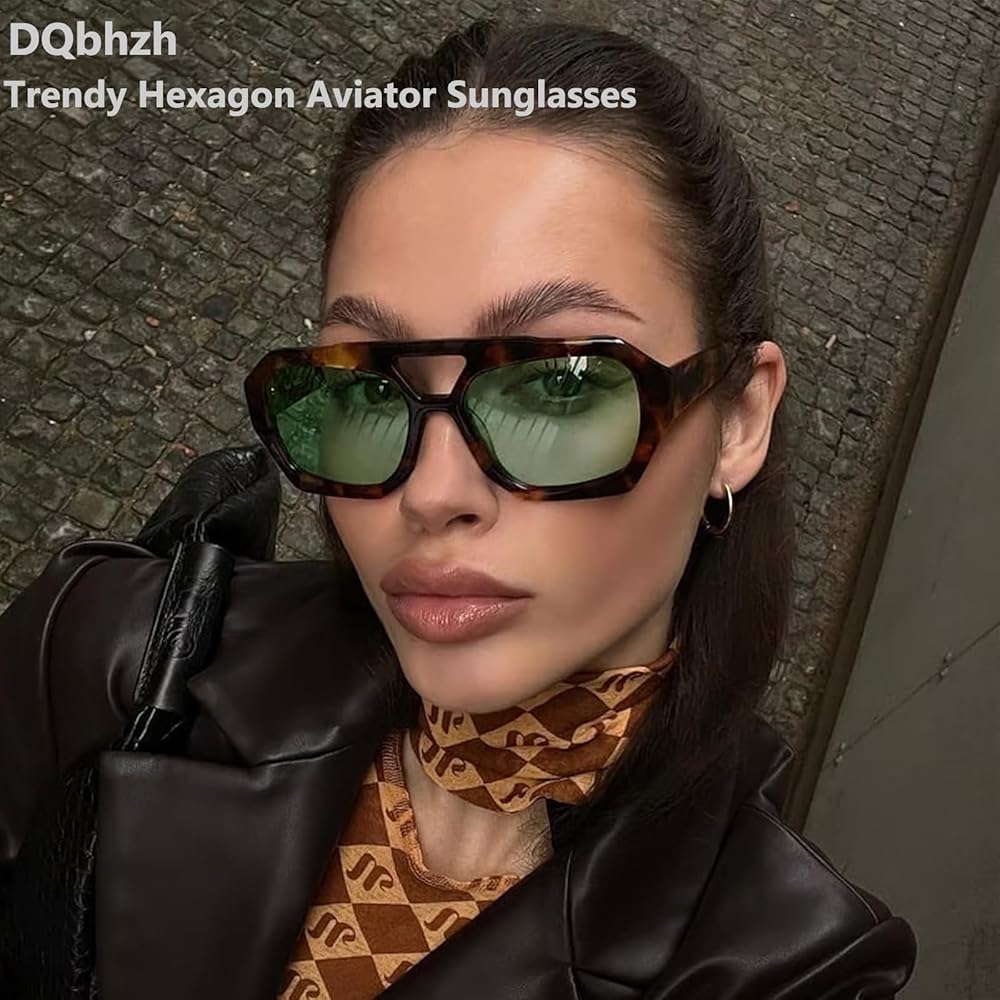 • Stylish and Unique Design:DQbhzh trendy hexagon aviator Sunglasses feature a unique hexagonal square shape ,with cool irregular square geometric tortoiseshell frame , gives them a unique, fashionable look that stands out,while the retro 70s 80s 90s popular double bridge adds an extra touch of sophistication. this chic sunglasses with a designer-inspired pilot style,can cater to different preferences and face shapes,making them a stylish choice for both men and women,it also a must have style