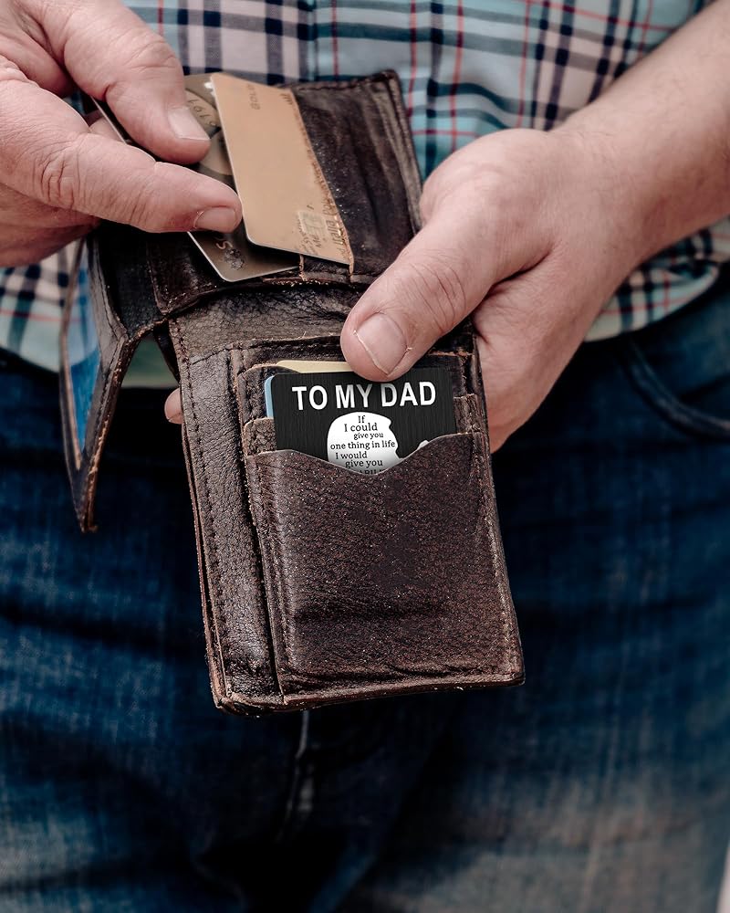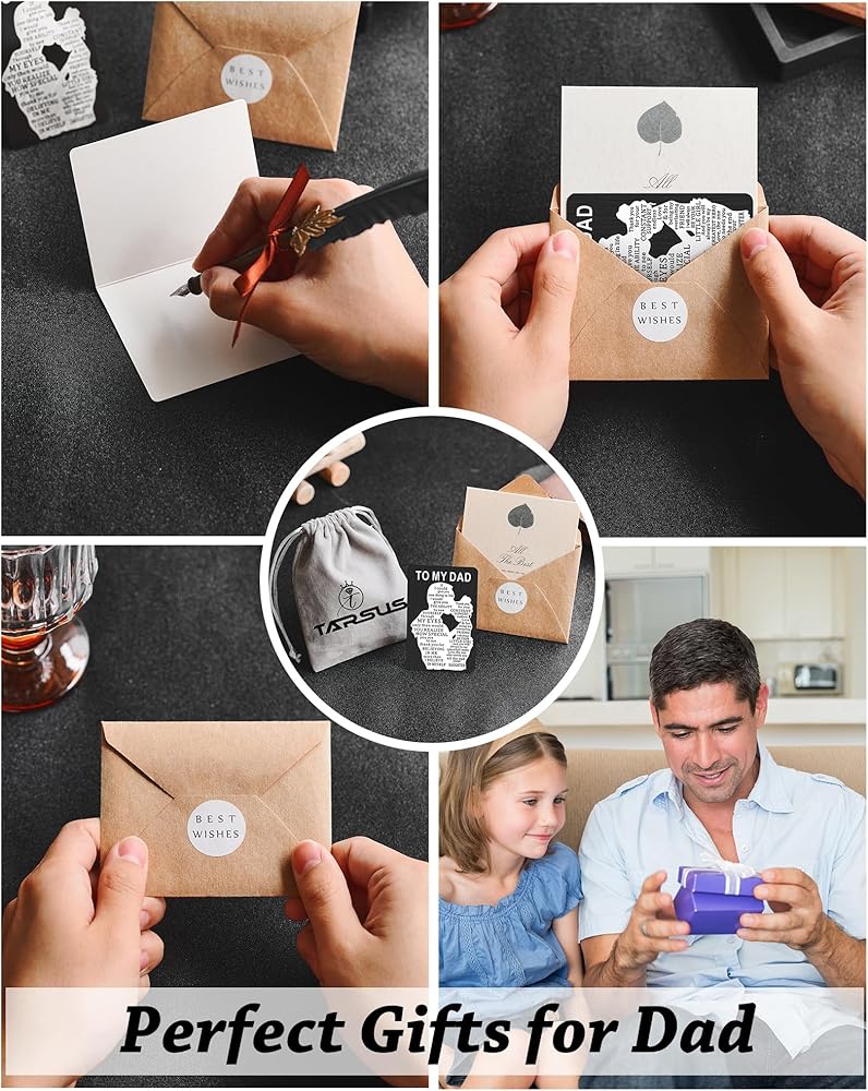 [الحجم والحزمة] - حجم بطاقة المحفظة - 3.38 بوصة × 2.13 بوصة × 0.03 بوصة، يناسب تمامًا أي محفظة. تأتي مع ظرف ورقي جميل، وحقيبة هدايا جميلة وجاهزة للتقديم، هدايا مثالية للأب