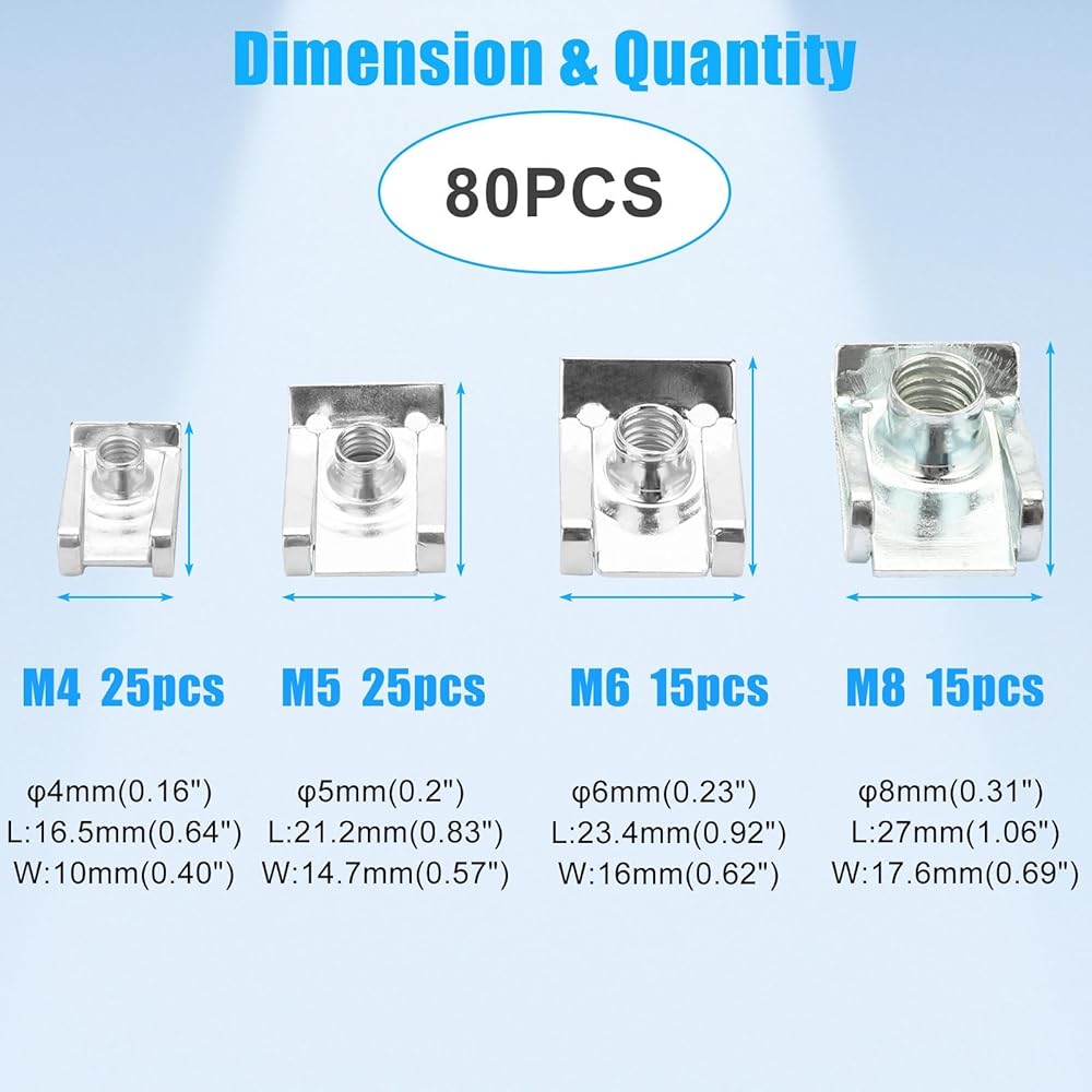 • 80 قطعة في 1: إجمالي 80 قطعة في علبة بلاستيكية. تتضمن 4 مقاسات شائعة: 25 قطعة M4 (φ0.2 × الطول 0.63 × العرض 0.4 بوصة)، 25 قطعة M5 (φ0.2 × الطول 0.63 × العرض 0.4 بوصة)، 15 قطعة M6 (φ0.23 × 0.63 × العرض 0.4 بوصة). 4 بوصة)، 15 قطعة M8 (φ0.31 × 0.63 × العرض 0.4 بوصة)