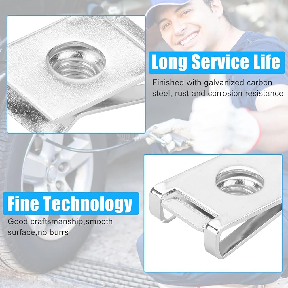 • هيكل متين: تتميز المشابك على شكل حرف U بهيكل عالي التحمل من أجل المتانة ومقاومة الكسر والتشقق. تشطيب مطلي بالزنك يحل محل مشابك U الصدئة أو المكسورة، ويثبت ألواح جسم السيارة، والقولبة، والجزء الداخلي للوحة باب لوحة أجهزة القياس