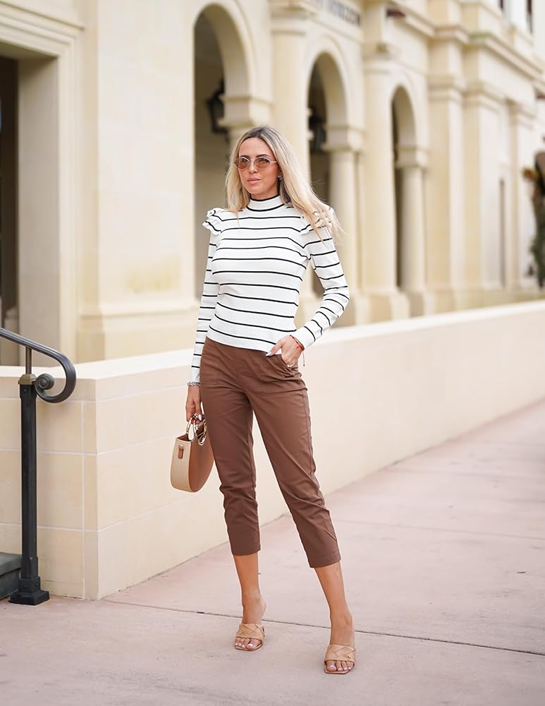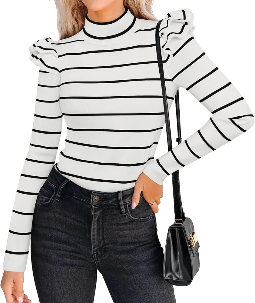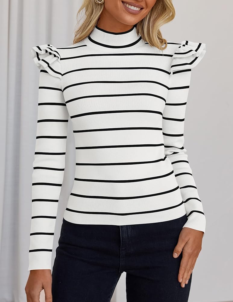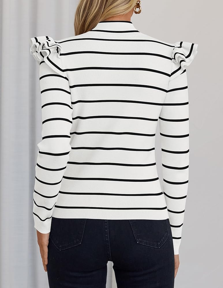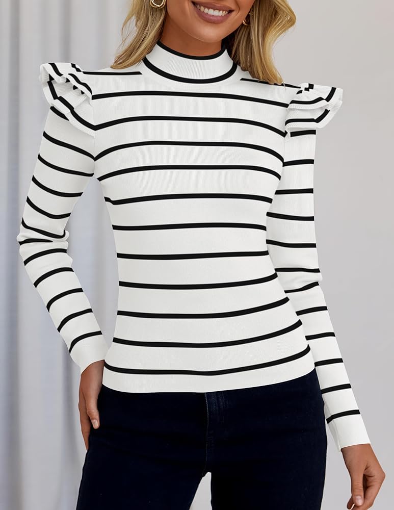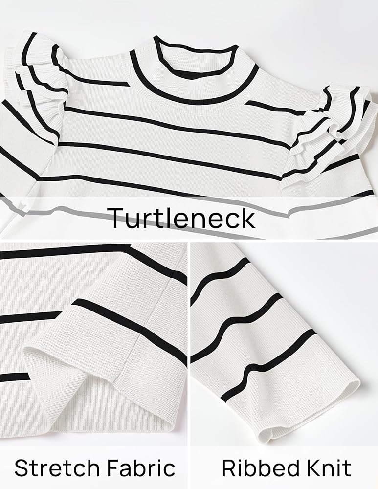 Features: Unique ruffle sleeves, cute cut, classic stripes, stylish turtleneck and soft ribbed knit. Great for keeping warm and adding a fashionable flair to your fall and winter outfits