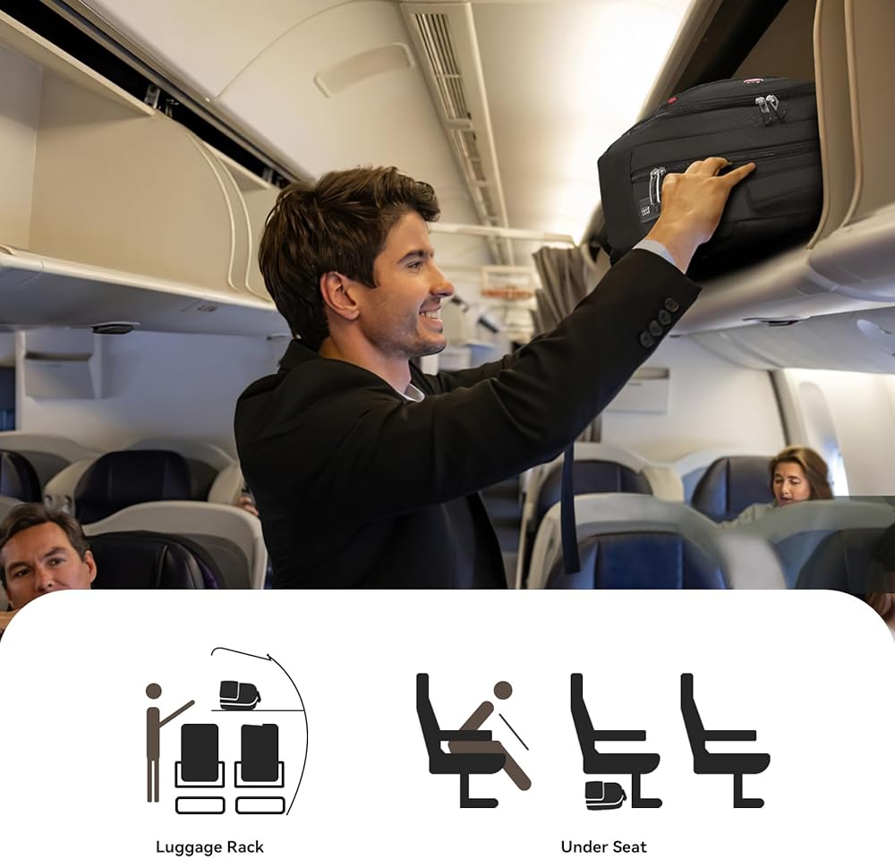 تصميم مريح: تتميز حقيبة الظهر بتصميم تهوية ثلاثي الأبعاد على شكل حرف U على الظهر، وأشرطة كتف شبكية قابلة للتعديل، وجيب مرن للأمتعة لتخفيف ضغط الكتف بشكل فعال. تناسبها بشكل مريح تحت مقاعد الطائرة أثناء السفر أو رحلات العمل