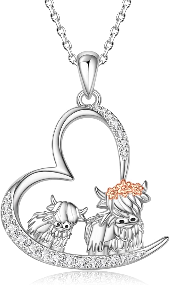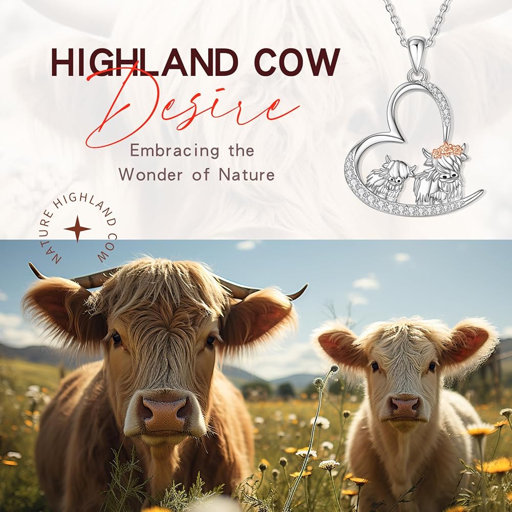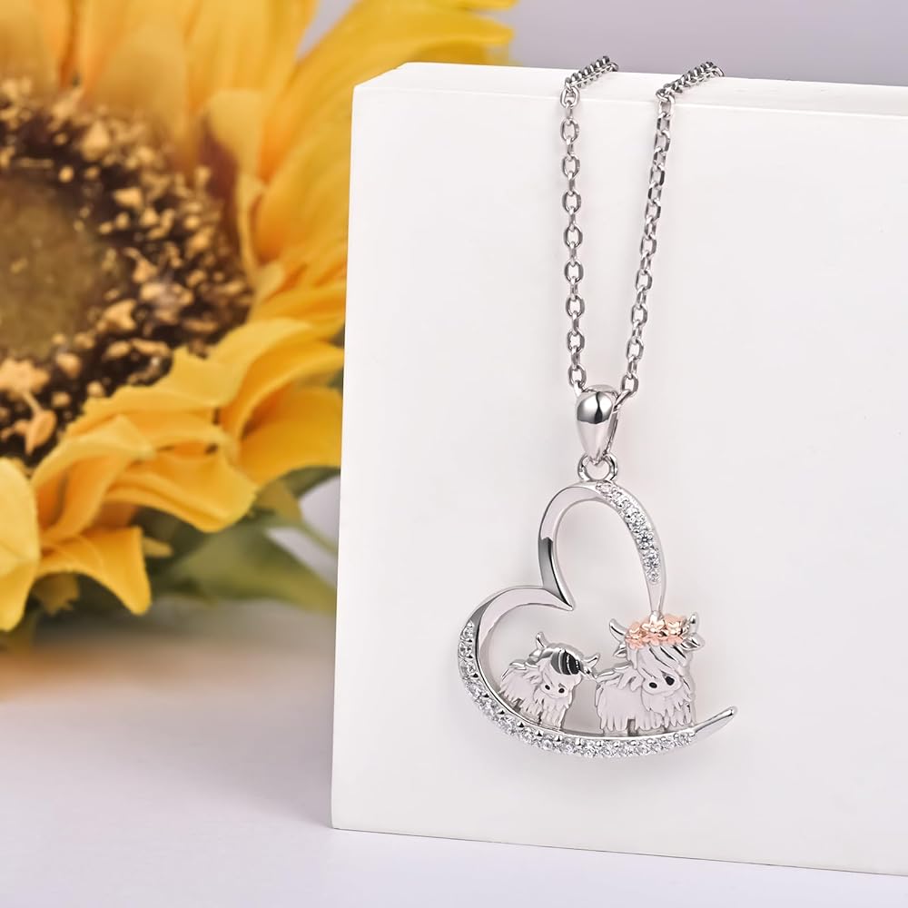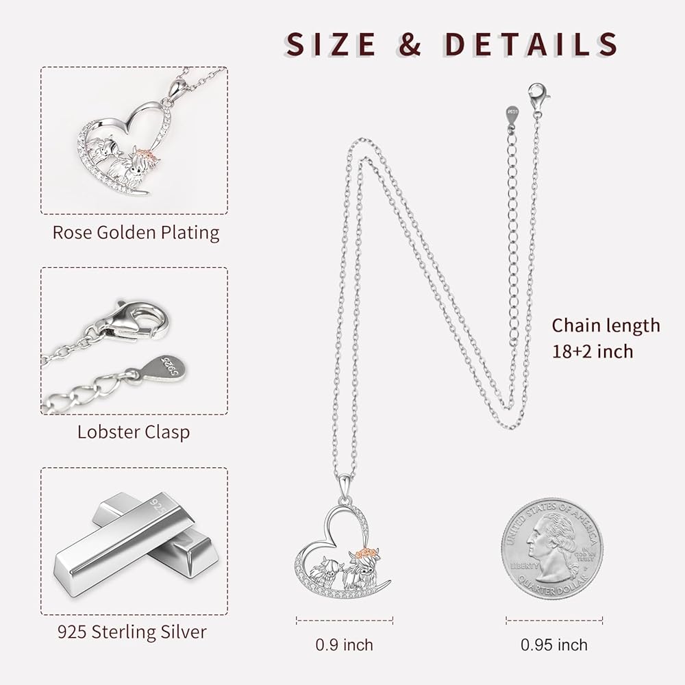 Design Ideal: Highland cows necklace for mom, open heart design with bright clear cubic zirconia, small cow close behinds a cow mommy, full of love and happiness, just like the love from our mom. Express your love for mom with this heartfelt mother daughter pendant
