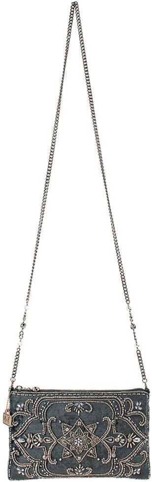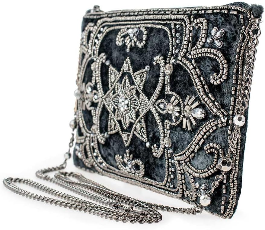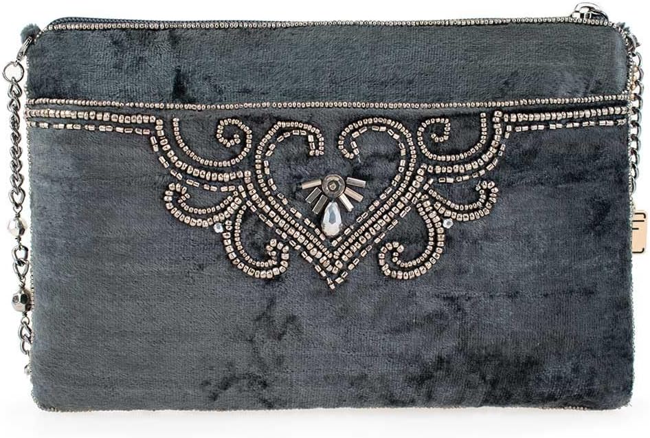 Silky soft pewter velvet is richly embellished with intricate beadwork to create the perfect going-out handbag for every occasion. Go hands free with the crossbody chain strap or remove it to carry as a clutch. Also available in olive green.