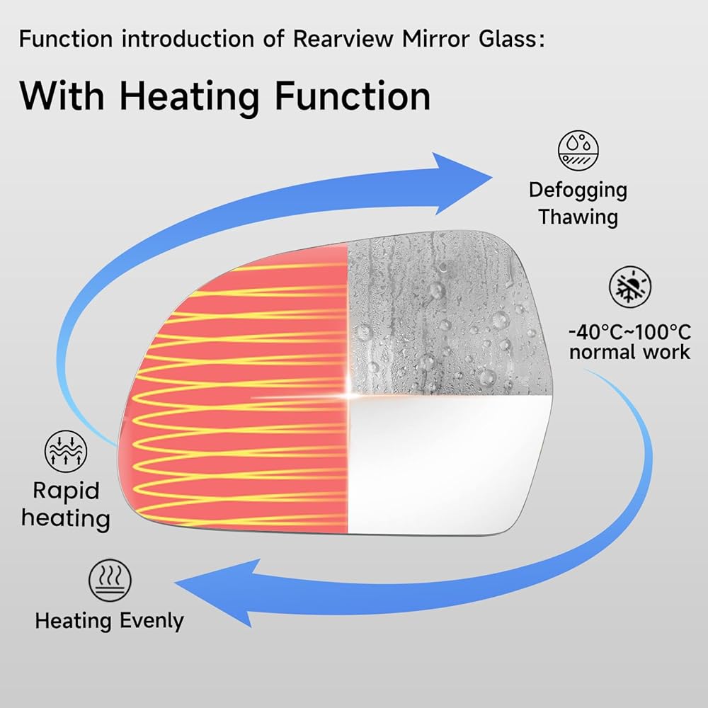 استبدال زجاج المرآة الجانبية للسائق الأيسر مع وظيفة التسخين: تم تصميم الجزء الخلفي الزجاجي لاستبدال مرآة السائق هذه بوظيفة التسخين، والتي يمكنها القضاء على الضباب وإذابة الجليد والثلج عن طريق التسخين من الداخل إلى الخارج. ملحوظة: هذا الزجاج له وظيفة التسخين فقط، ولا يوجد كشف للبقع العمياء، ولا يوجد مصباح إشارة، ولا وظيفة مضادة للوهج ولا وظيفة التعتيم التلقائي.