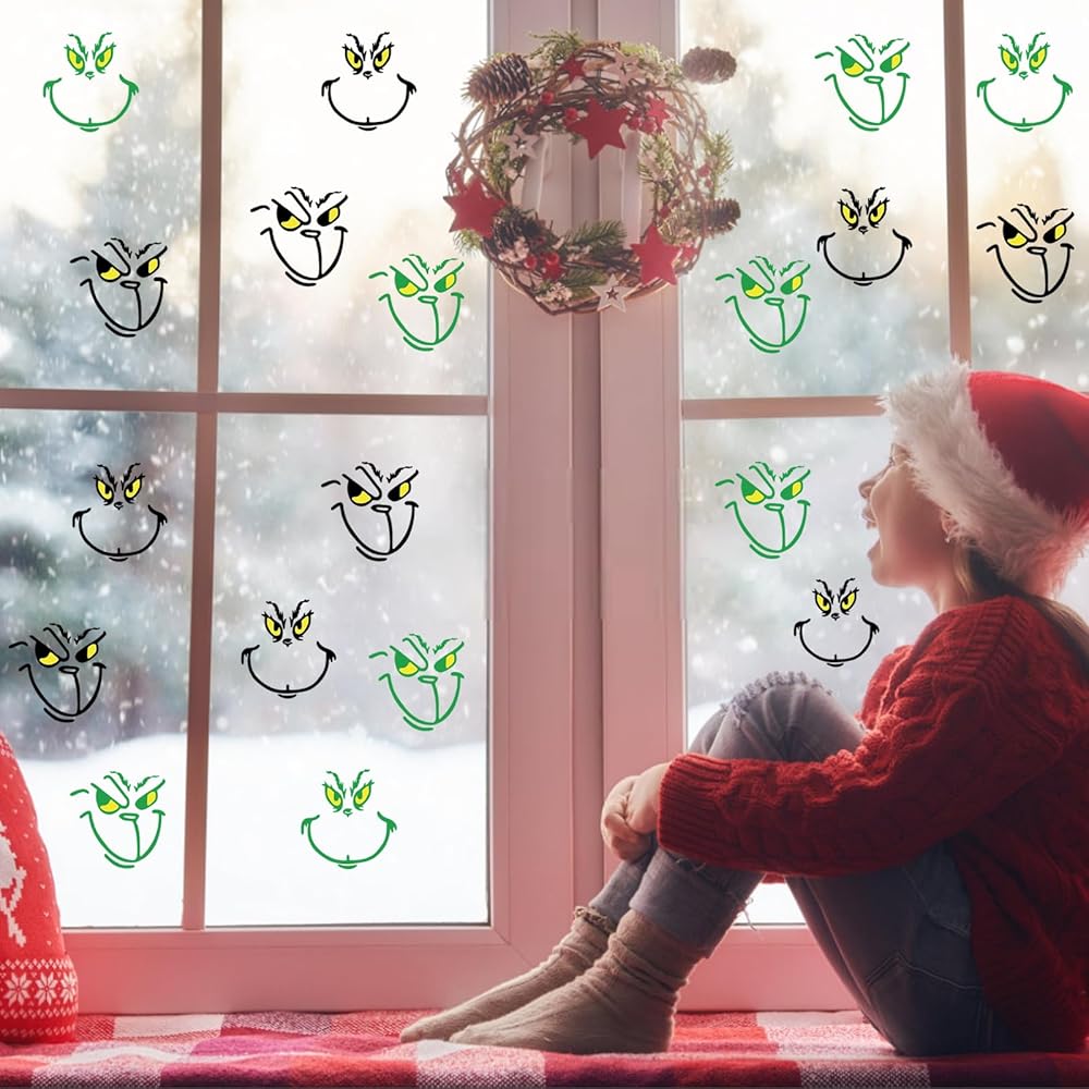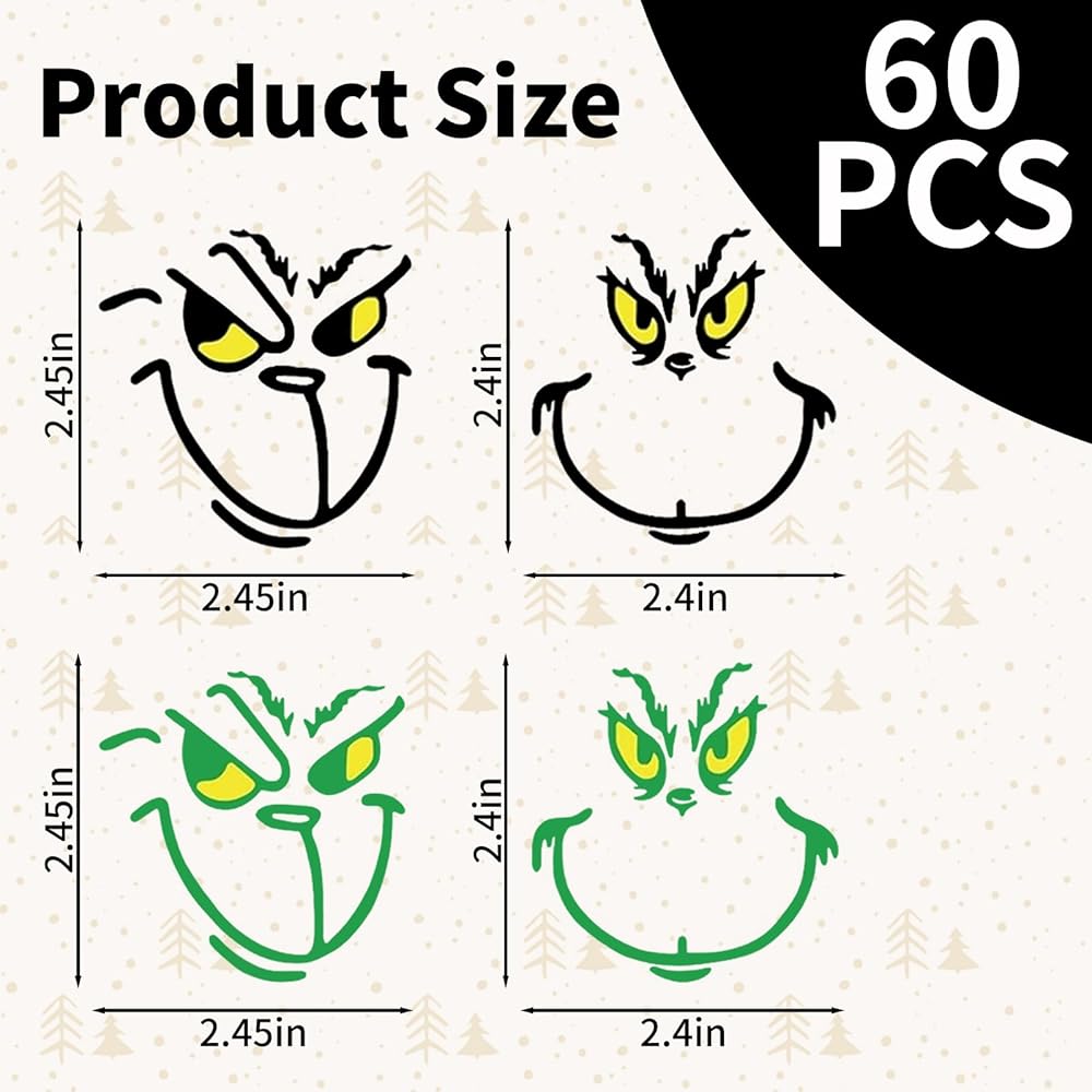 60 قطعة من ملصقات زينة عيد الميلاد، ملصقات مقاومة للماء لحفلات عيد الميلاد، ملصقات وجه عيون صفراء وخضراء، ملصقات فينيل عيد الميلاد، لتزيين النوافذ والجدران وبطاقات التهنئة