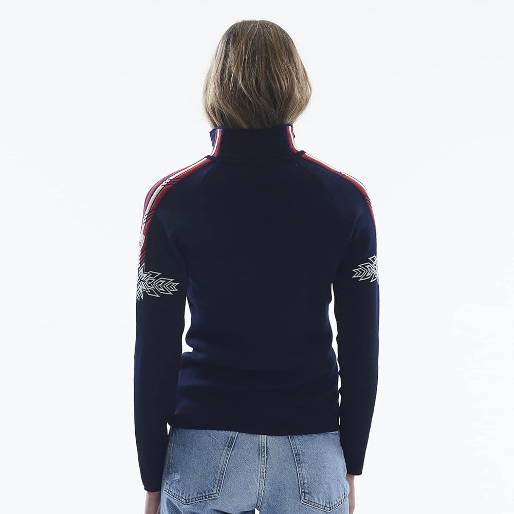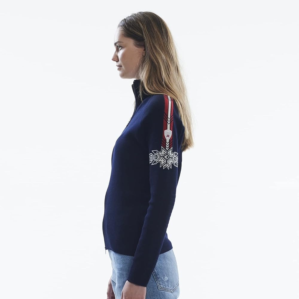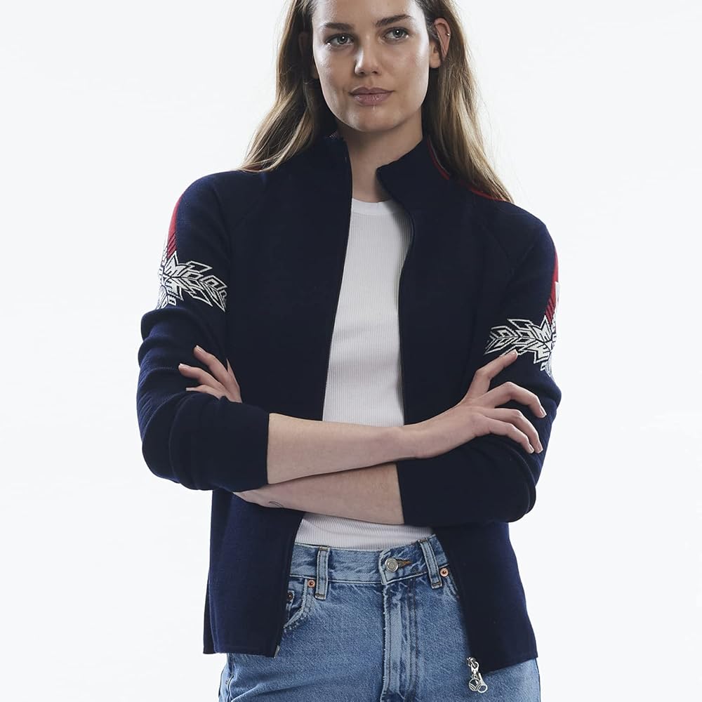 تصميم نرويجي: تتميز هذه السترة الصوفية بسحاب ثنائي الاتجاه في الأمام، وخطوط مبطنة بلون العلم على الأكتاف، وبطانة للمرفق؛ تلميح إلى سترات جبال الألب الكلاسيكية من السبعينيات