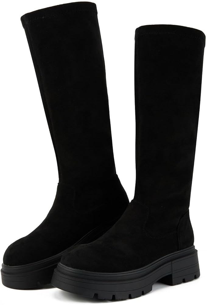 The knee boots are made of faux suede upper, synthetic cloth lining for added comfort. No-slip TPR outsole for both indoor or outdoor wear. Additionally, platform knee-high boots visually elongate the legs, providing a significant height boost without the discomfort of traditional high heels, ensuring stability and ease of movement. These high boots blend functionality with fashion, making them suitable for both casual and formal wear. They are matched well with dresses, short skirts, jeans, windbreakers, sweaters, etc. An ideal choice for shopping, dating, and parties.