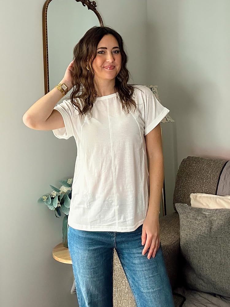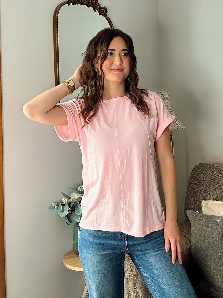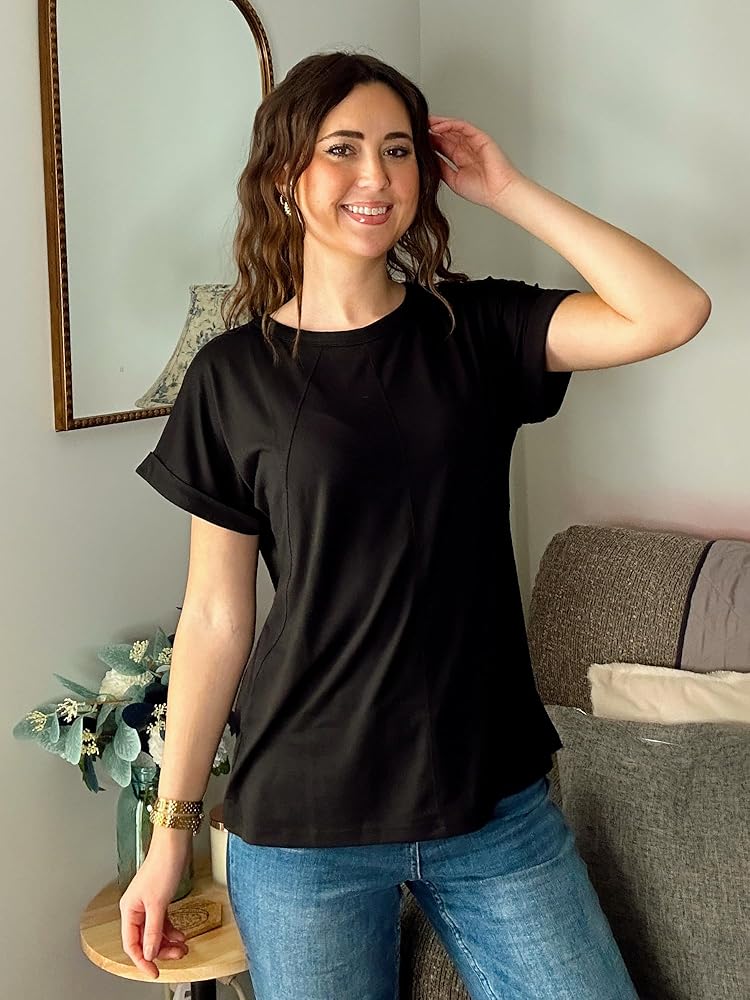 تصميم كلاسيكي: يضيف تصميم الطيات في الجزء الأمامي لمسة مرحة وأنيقة، وتوفر الحاشية المنحنية تنوعًا مطويًا أو غير مطوي. رفع هذا القميص النسائي إلى ما هو أبعد من الأساسي. هذا القميص ذو الأكمام القصيرة يمكن ارتداؤه بسهولة مع السراويل القصيرة أو السراويل أو الجينز أو السراويل الضيقة أو التنانير للحصول على مظهر عصري، مما يعزز جاذبيتك ويحصل على الإطراء.