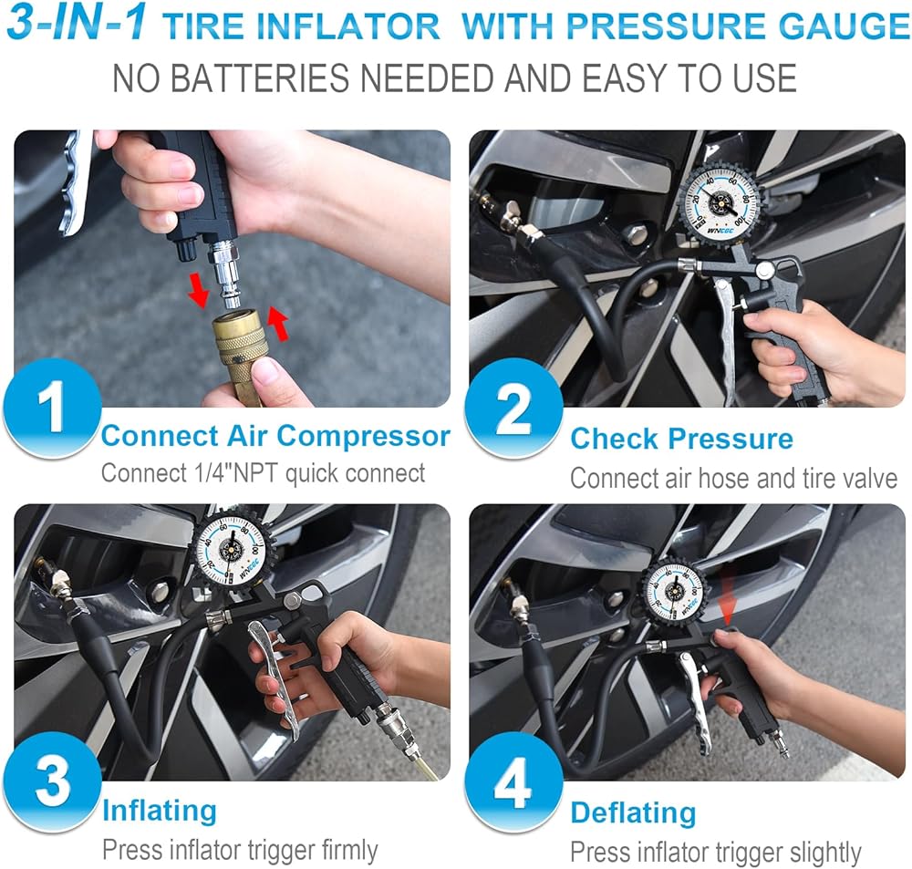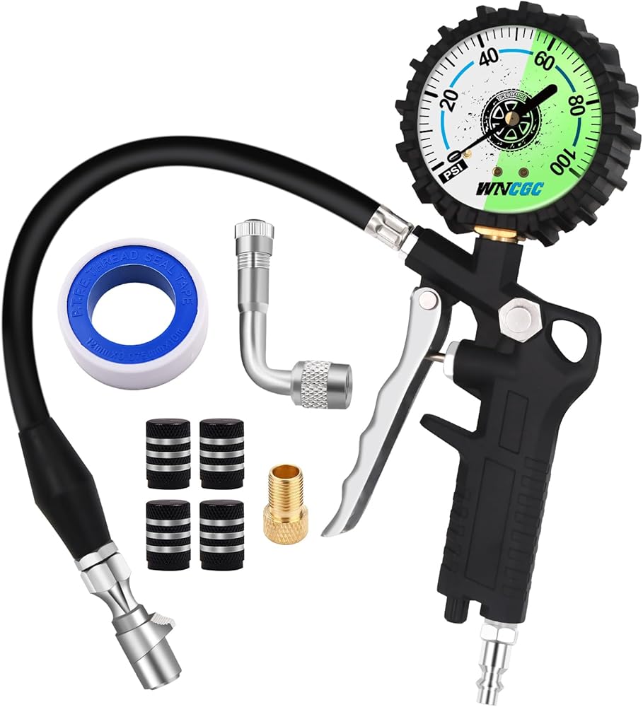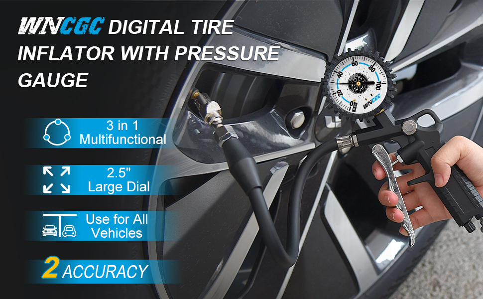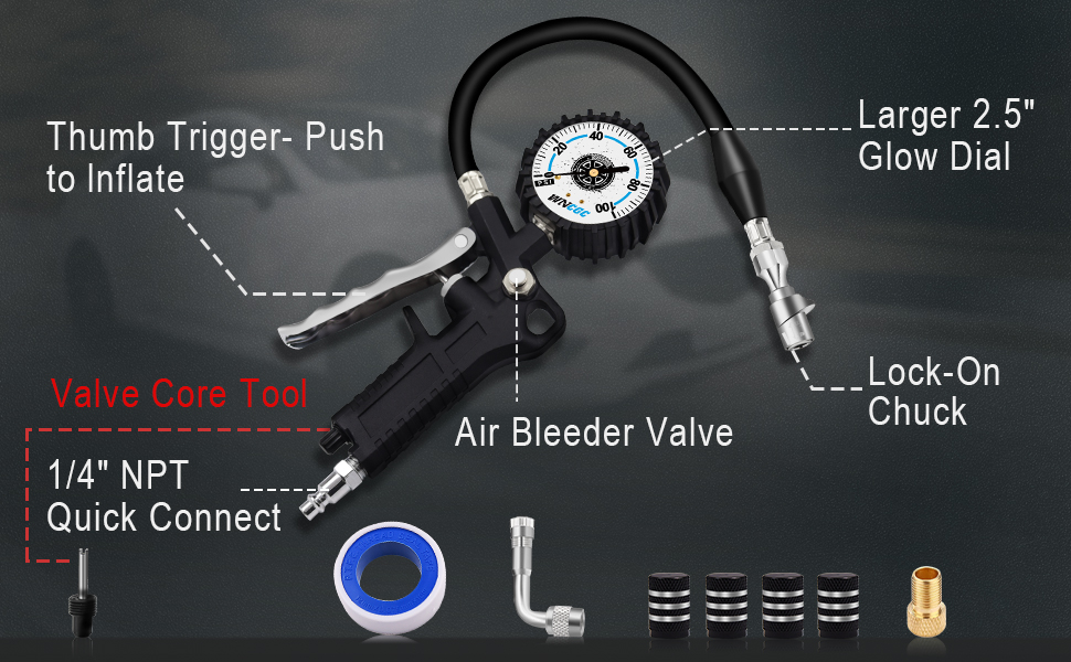 سهل الاستخدام --- مقياس ضغط الهواء WNCGC له 3 وظائف للتفريغ والنفخ وفحص ضغط الإطارات. اضغط على الزناد لنفخ الإطار، اضغط على الزر لتفريغ الإطار، وقم بالضغط على ضغط الإطار عند اكتشاف الهواء المضغوط. توجد أداة أساسية لصمام الإطارات في الجزء السفلي من مقياس ضغط الهواء في الإطارات.