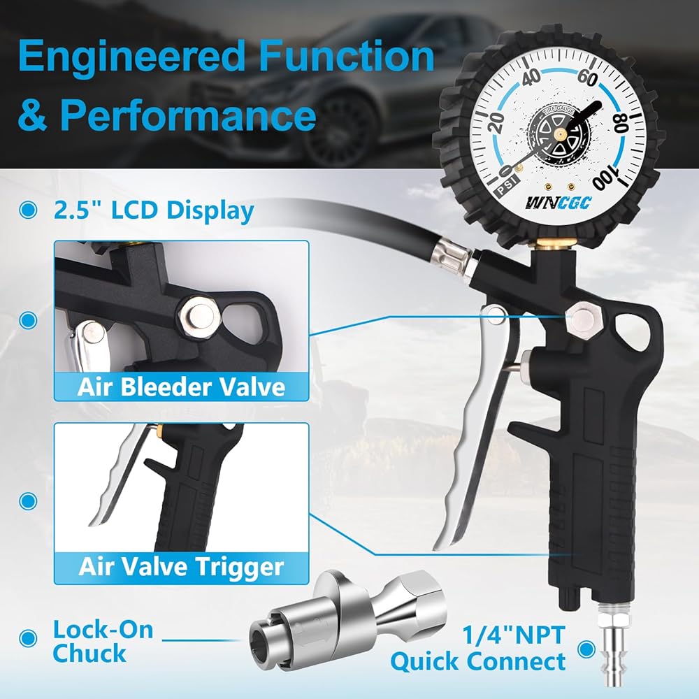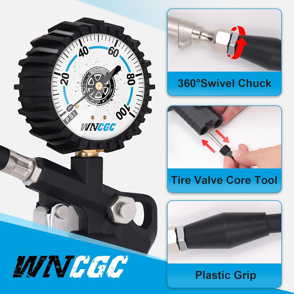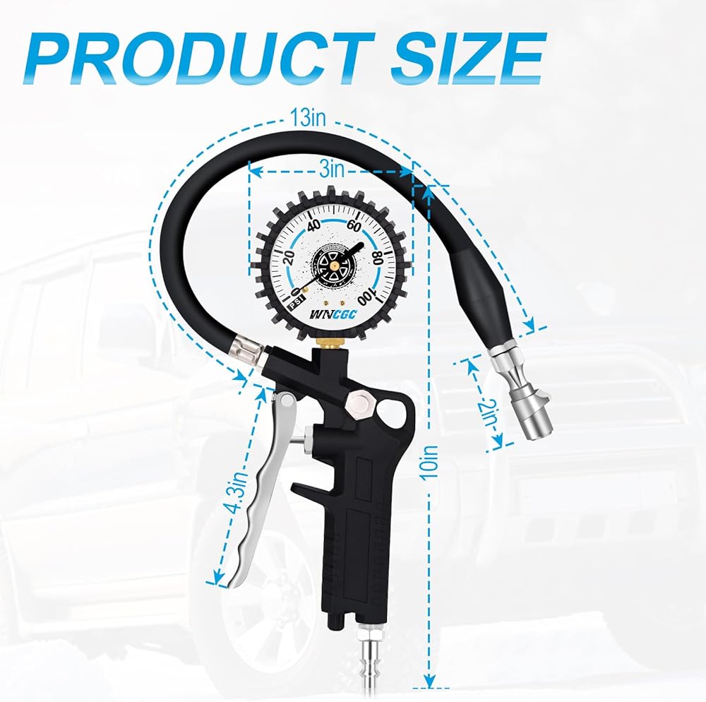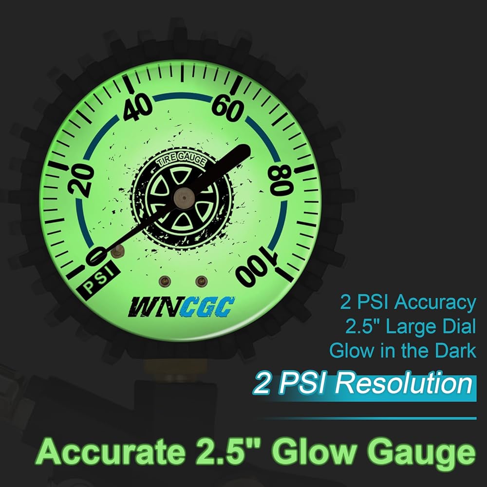 مقياس ضغط منفاخ الإطارات 100 رطل لكل بوصة مربعة ضغط الهواء في الإطارات مع قفل ظرف الهواء وملحقات ضاغط الهواء مع قرص متوهج كبير سهل القراءة مقاس 2.5 بوصة