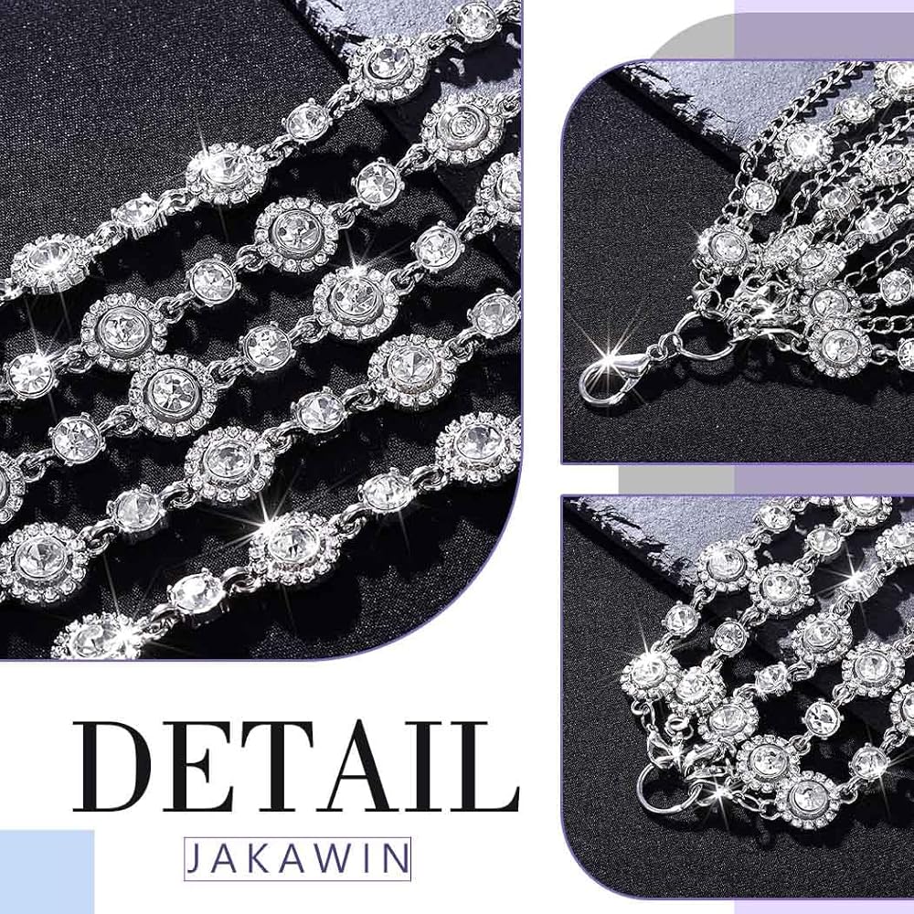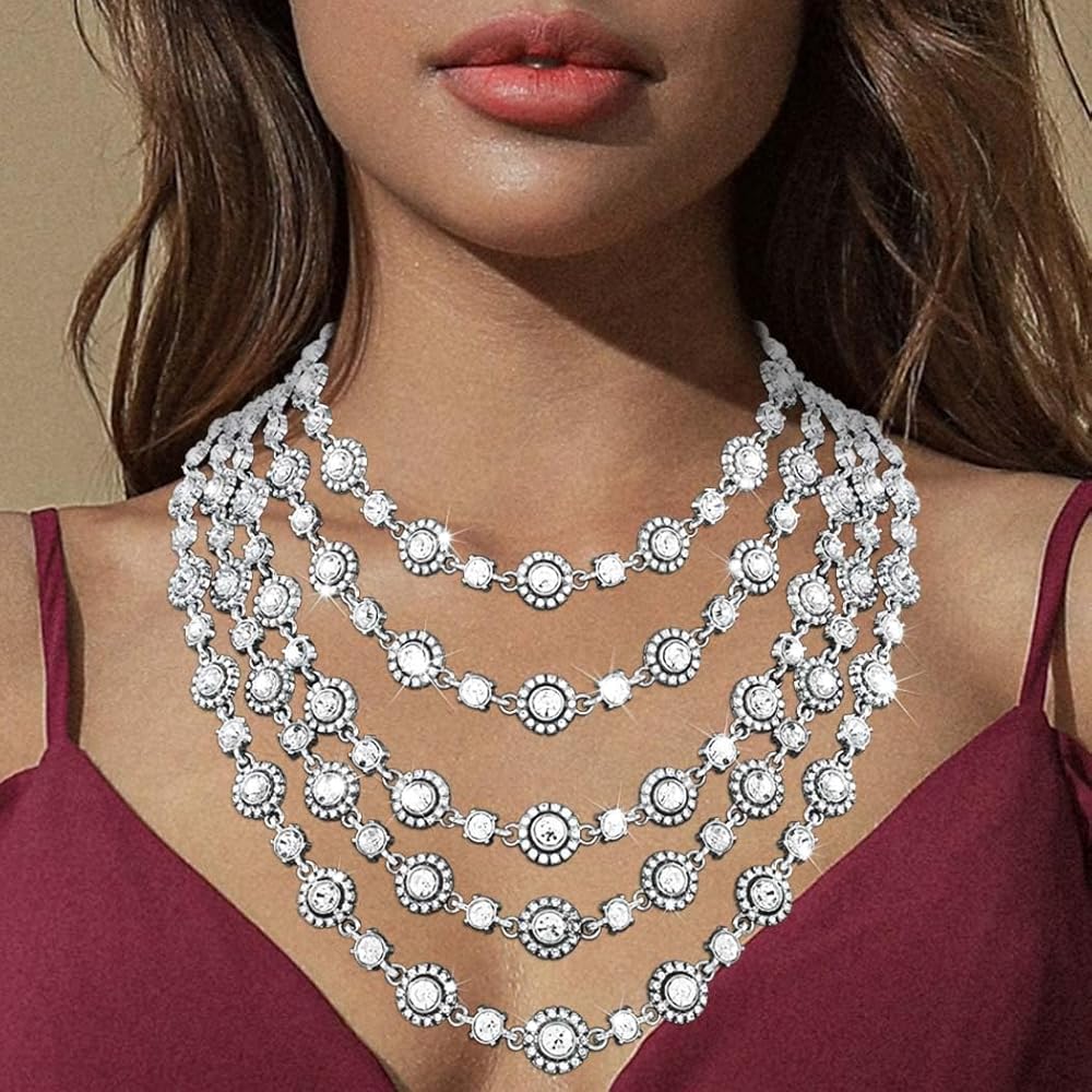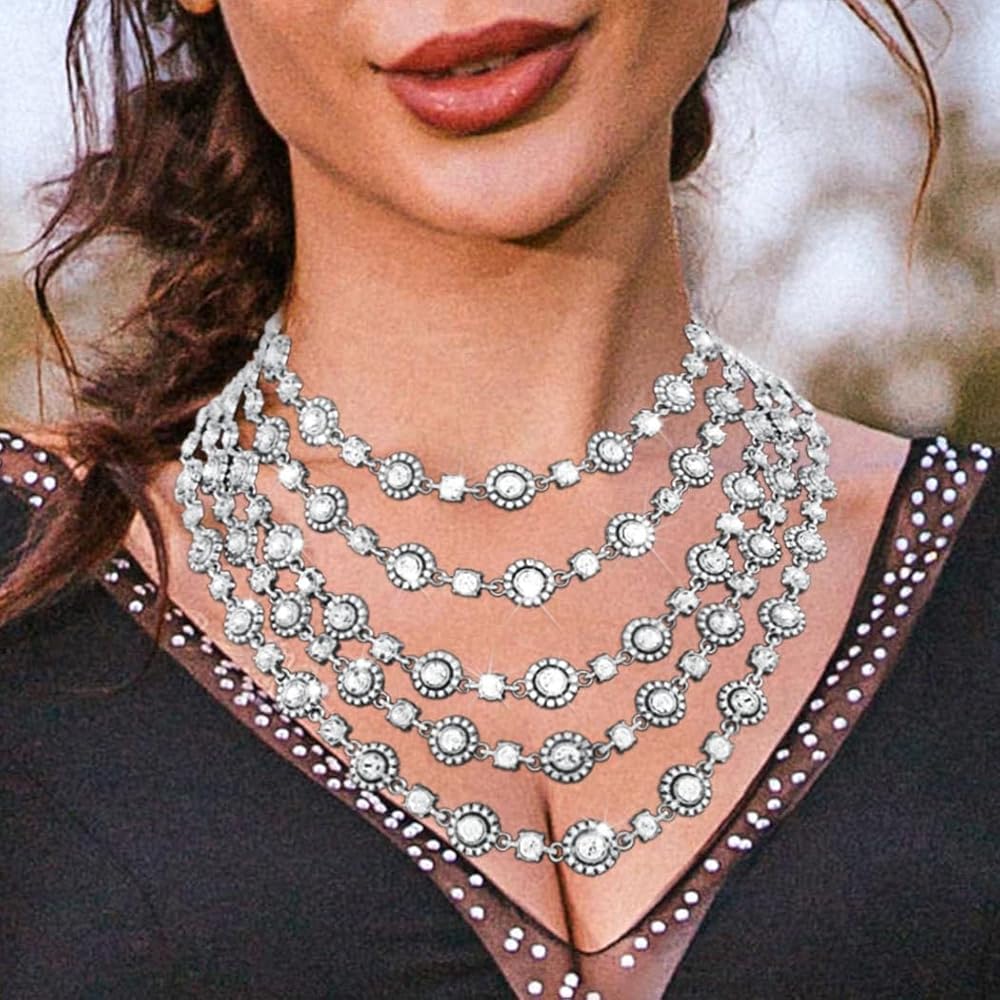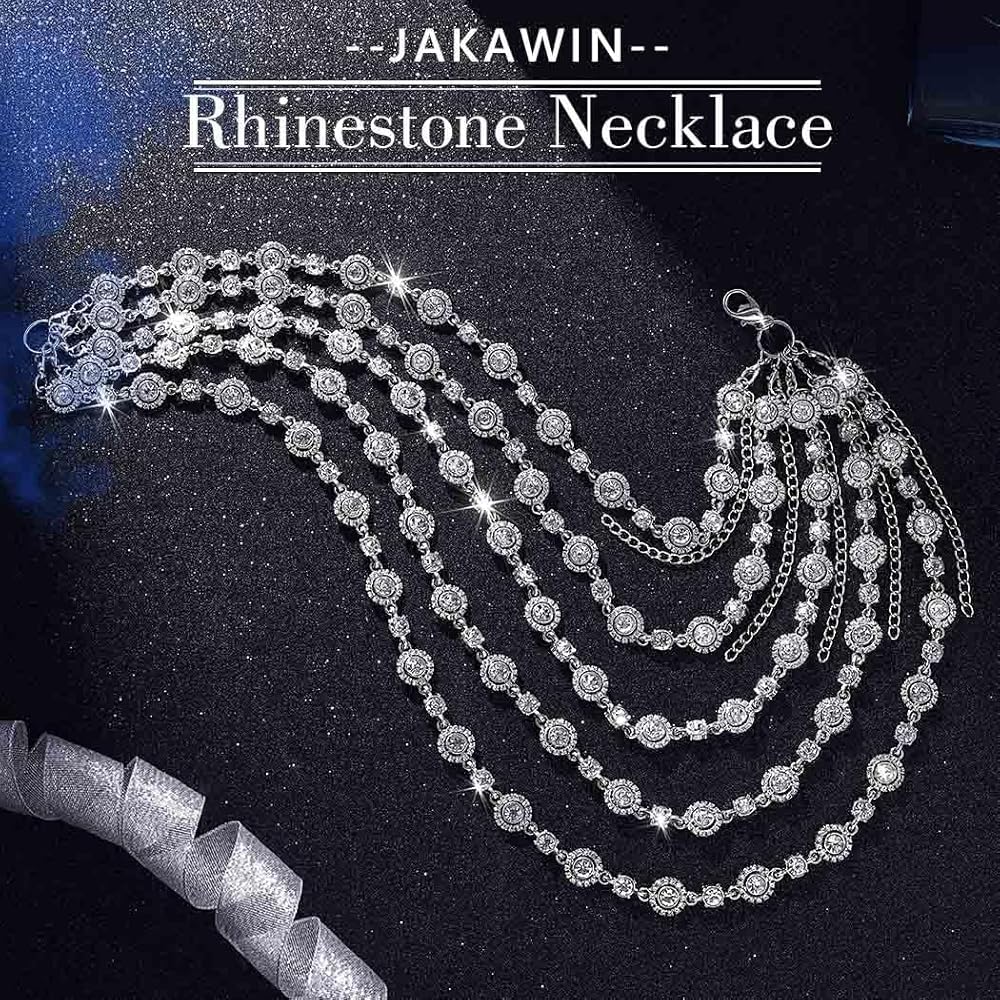 JAKAWIN الطبقات حجر الراين قلادة العروس طقم مجوهرات الزفاف الفضة متعدد الطبقات طوق القلائد سلسلة للنساء NK328