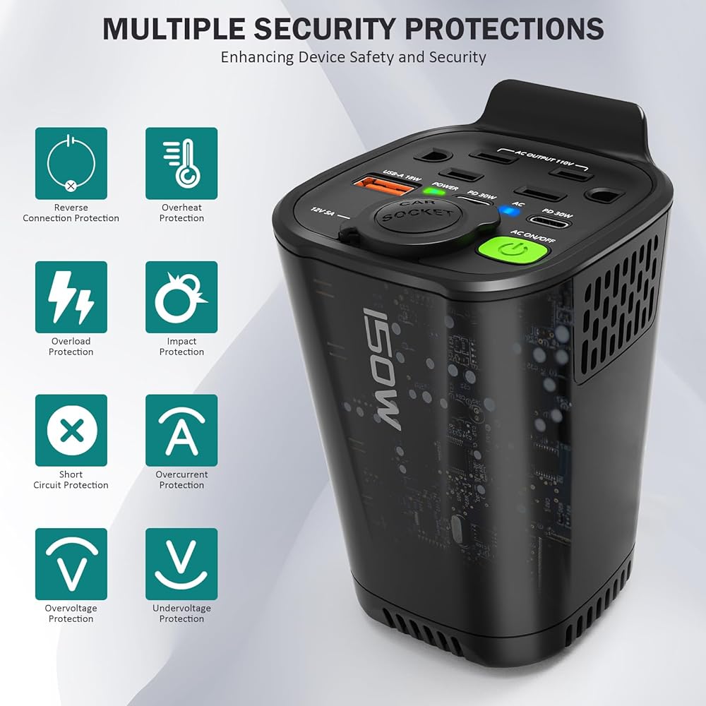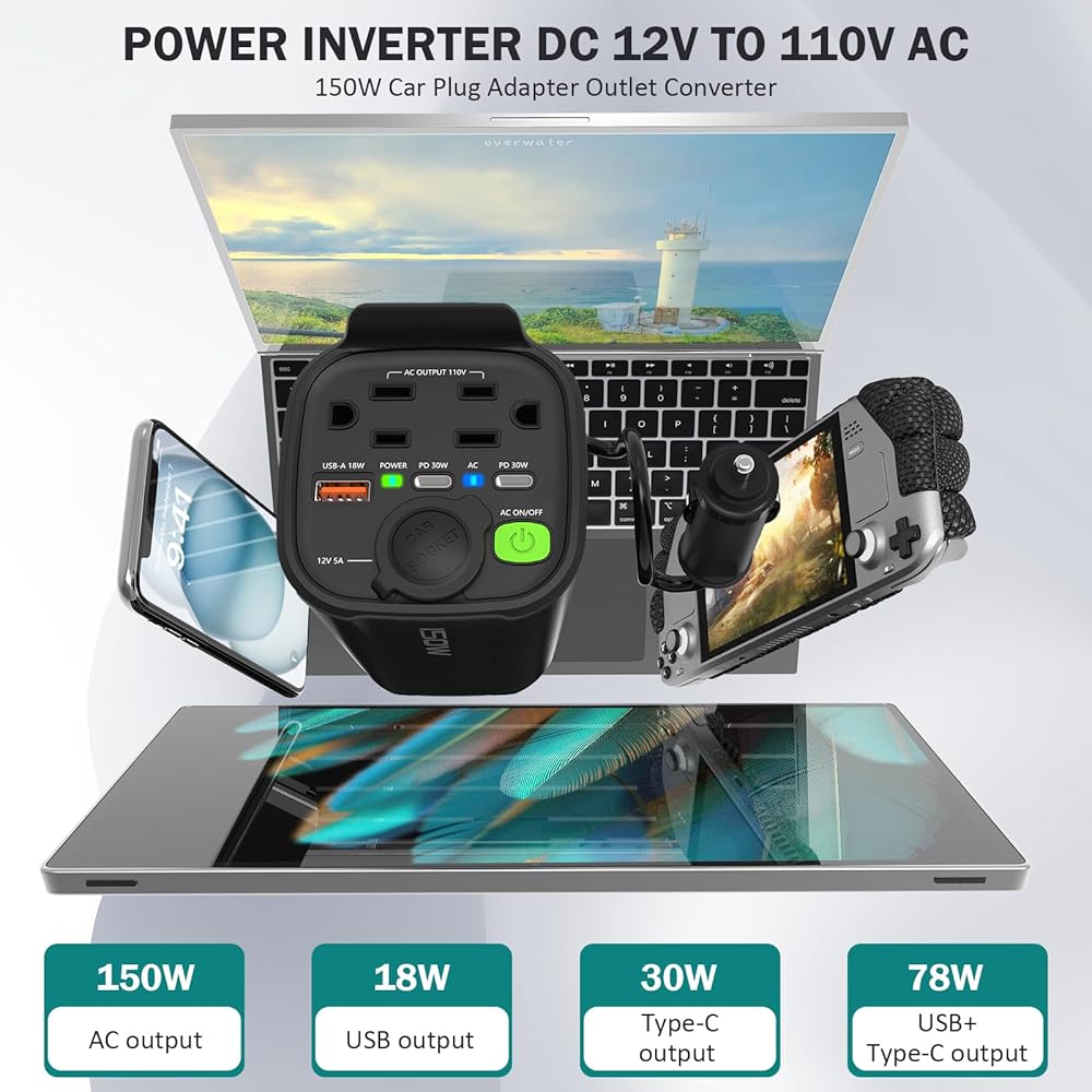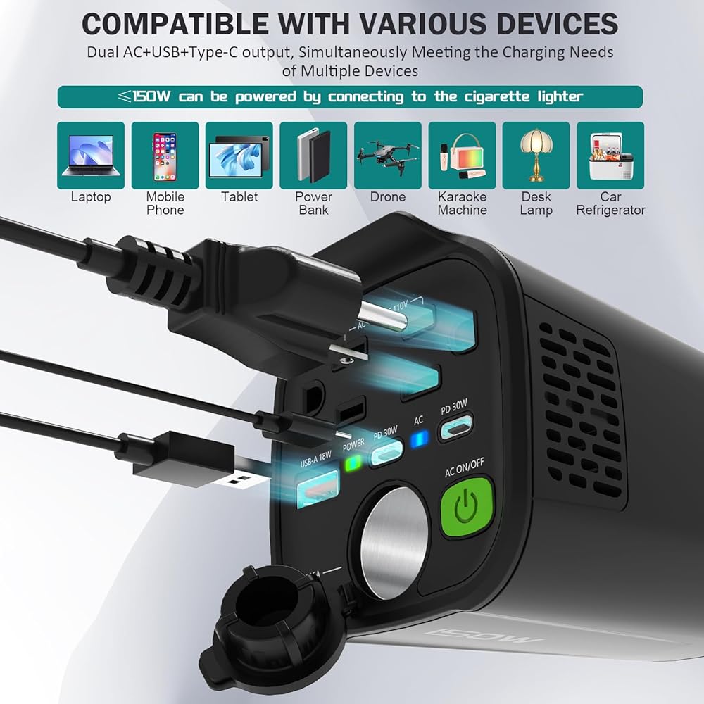 تحويل قوي: يمكن لعاكس طاقة السيارة Giecy تحويل طاقة سيارتك بتيار مستمر 12 فولت إلى طاقة منزلية بتيار متردد 110 فولت دون عناء باستخدام عاكس طاقة السيارة بقدرة 150 وات. مثالي لتشغيل أجهزة الكمبيوتر المحمولة والأجهزة الصغيرة والأجهزة الإلكترونية الأخرى أثناء التنقل.
