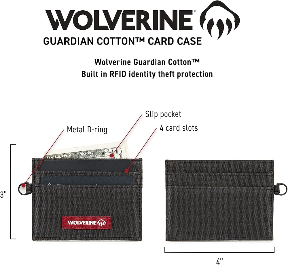 AMPLE STORAGE CAPACITY: The WOLVERINE Rigger Card Case features 4 card slots, 1 slip pockets, and ID window, making it the perfect accessory when you want something slim and lightweight. Measures 3" H x 4" W.