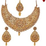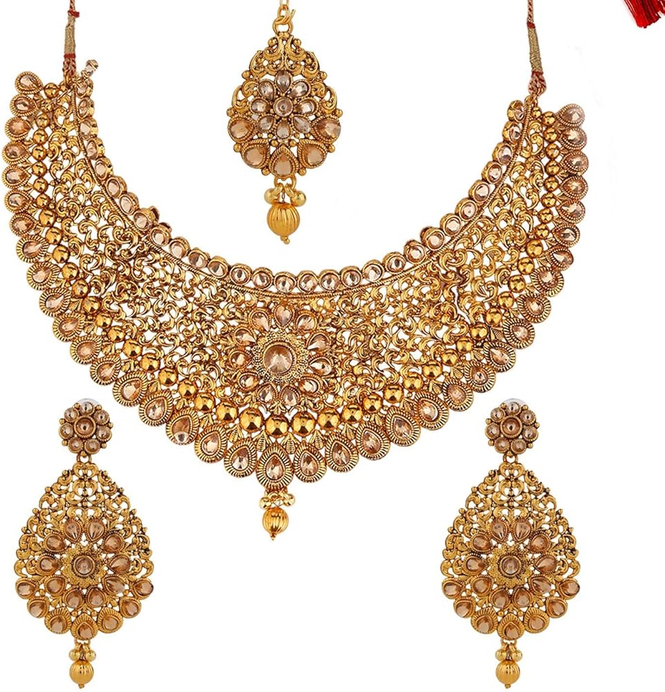 - هذه قلادة صلبة غير قابلة للطي، مزينة بأحجار الراين والكريستال والأحجار، مما يمنحها مظهرًا تقليديًا مثاليًا. مجموعة مجوهرات الزفاف الهندية.