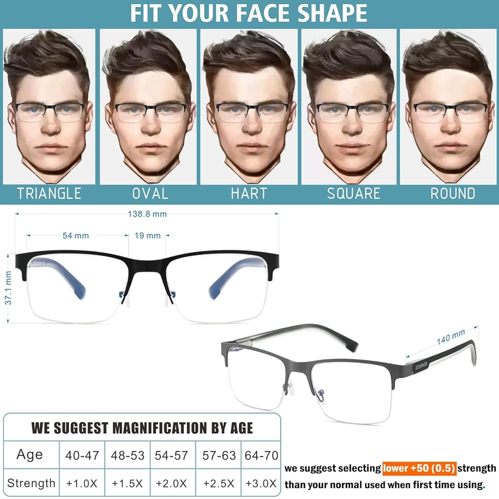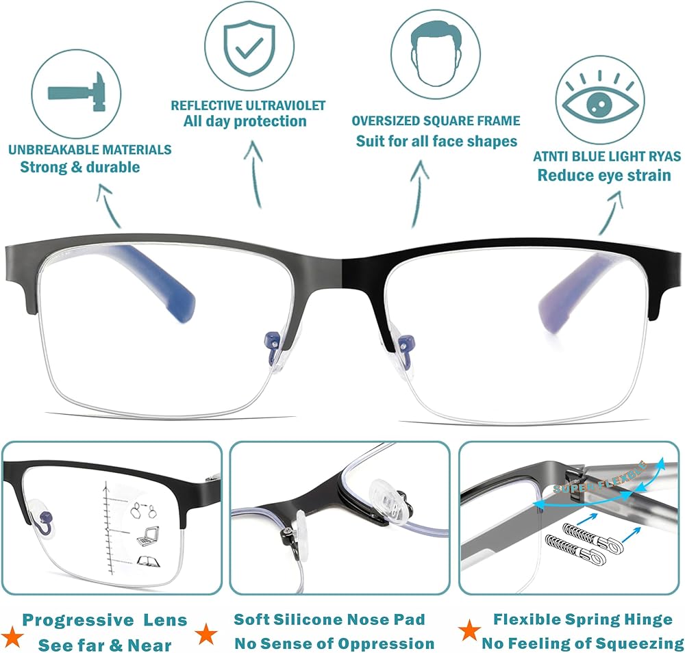 قديم وخفيف الوزن ومريح: تمتع بتجربة الراحة مع نظارتنا ثنائية البؤرة طويلة النظر خفيفة الوزن. نصف الإطارات مصنوعة من معدن مسدس غير قابل للكسر مع مفصلات زنبركية عريضة ومرنة بشكل متين لملاءمة آمنة ومريحة. تتميز بوسادات أنف سيليكون ناعمة صديقة للبشرة وخالية من مسببات الحساسية تعمل نظارات Jcuangr التقدمية على تقليل عبء الأنف وتوفير الراحة طوال اليوم. التصميم المربع القديم والمواد عالية الجودة لهذه العدسات متعددة البؤر القابلة للتعديل تجعلها رائعة لاحتياجات القراءة أو المسافة.