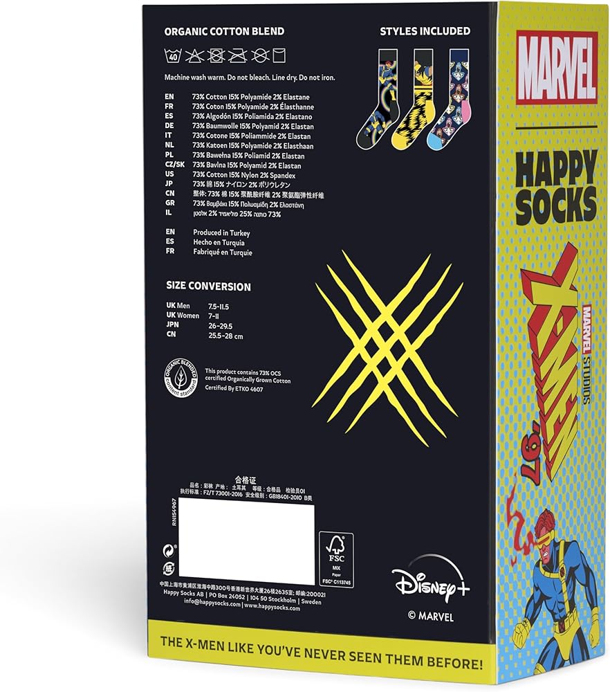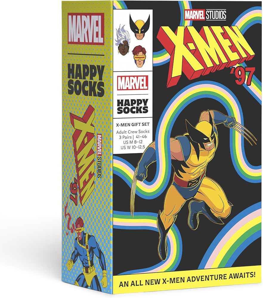 • For the true fans, there's the all-inclusive triple feature containing each of the three socks from the new X-MEN collection. Beyond containing some of the most astonishing socks ever produced, the box itself features an original and colorful design depicting everyone's favorite adamantium-reinforced mutant! So what are you waiting for?