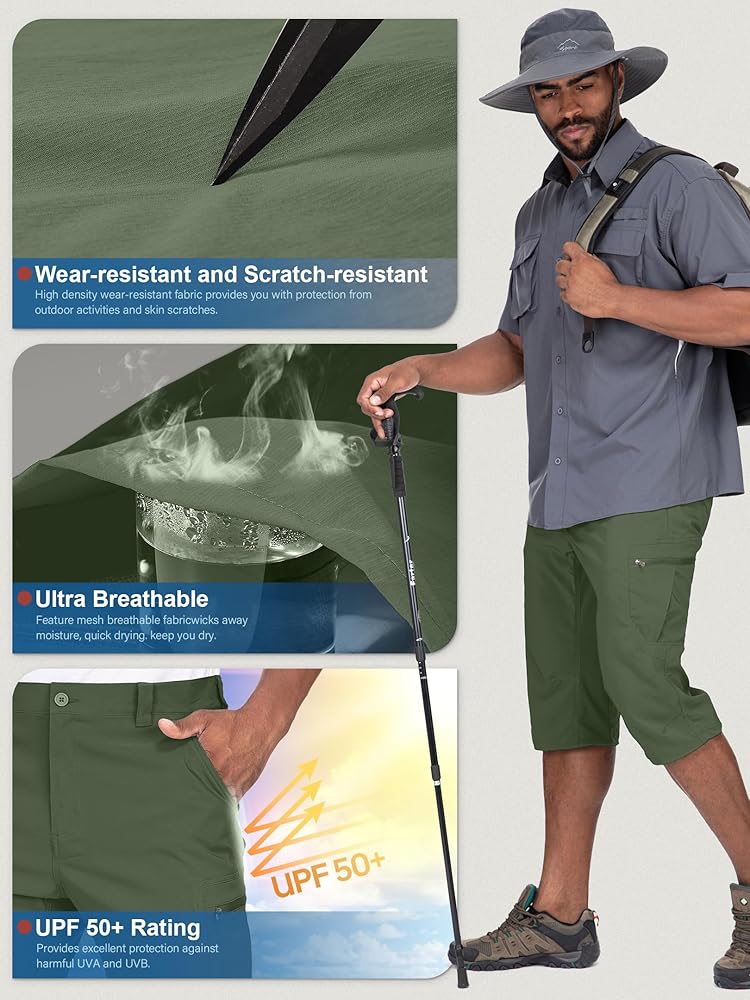 • شورت طويل للرجال تحت الركبة يتميز بجيوب متعددة مع سحاب أو حلقة إغلاق بخطاف، مما يخلق مساحات أكبر لتخزين المحفظة والسكاكين والأدوات والمفاتيح والمصابيح الكاشفة وغيرها من الضروريات، يحرر يديك.