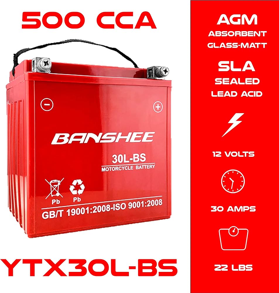 - نوع البطارية: YTX30L BS/YIX30L-BS؛ الجهد: 12؛ السعة: 30 آه؛ الأبعاد: 6.54 × 4.96 × 6.89 بوصة؛ CC:500؛ الوزن: 22 رطل؛ أداء عالي، صيانة مجانية، اجتماع الجمعية العامة العادية المختوم، ضمان إرجاع أو استعادة الأموال لمدة 30 يومًا،