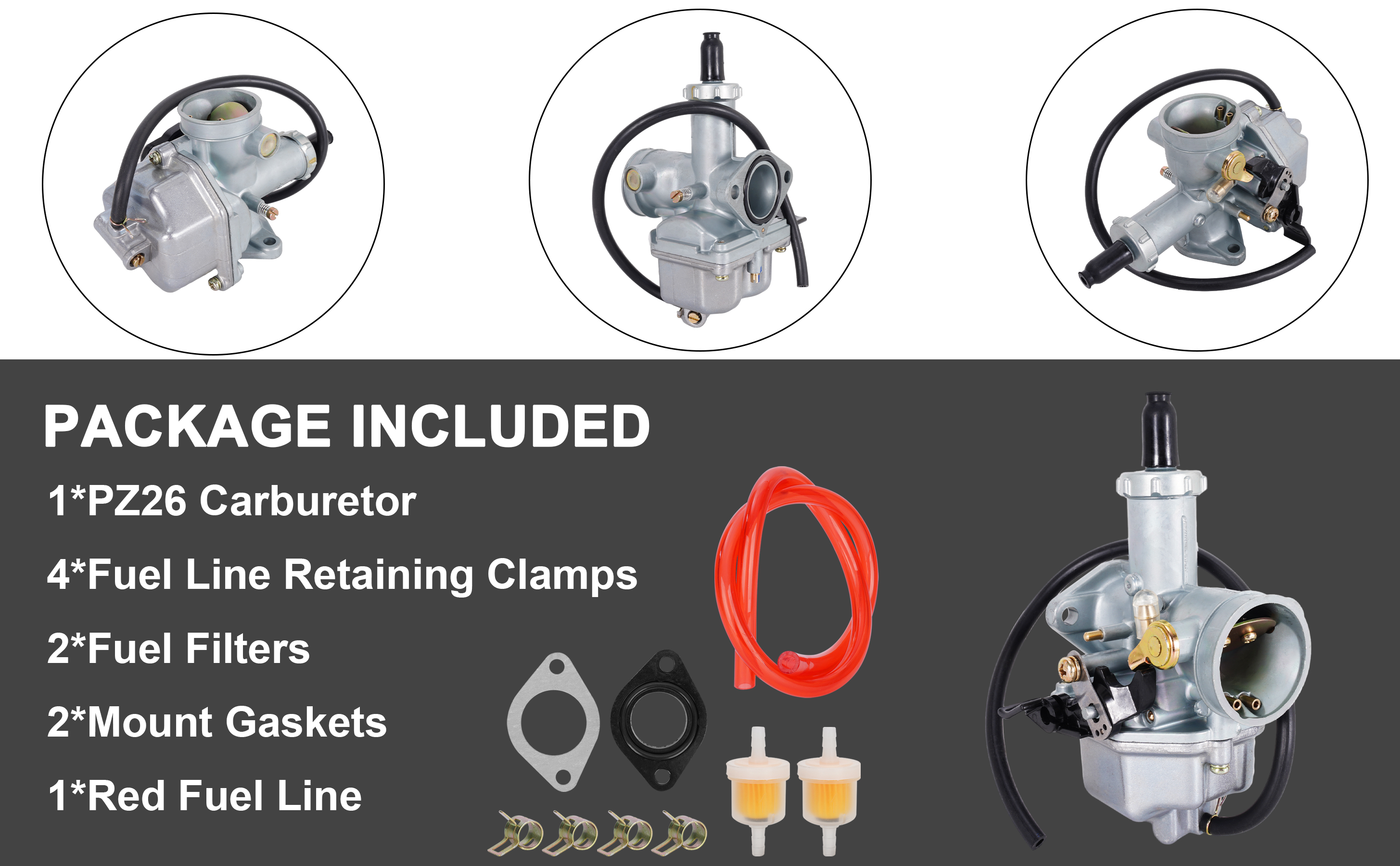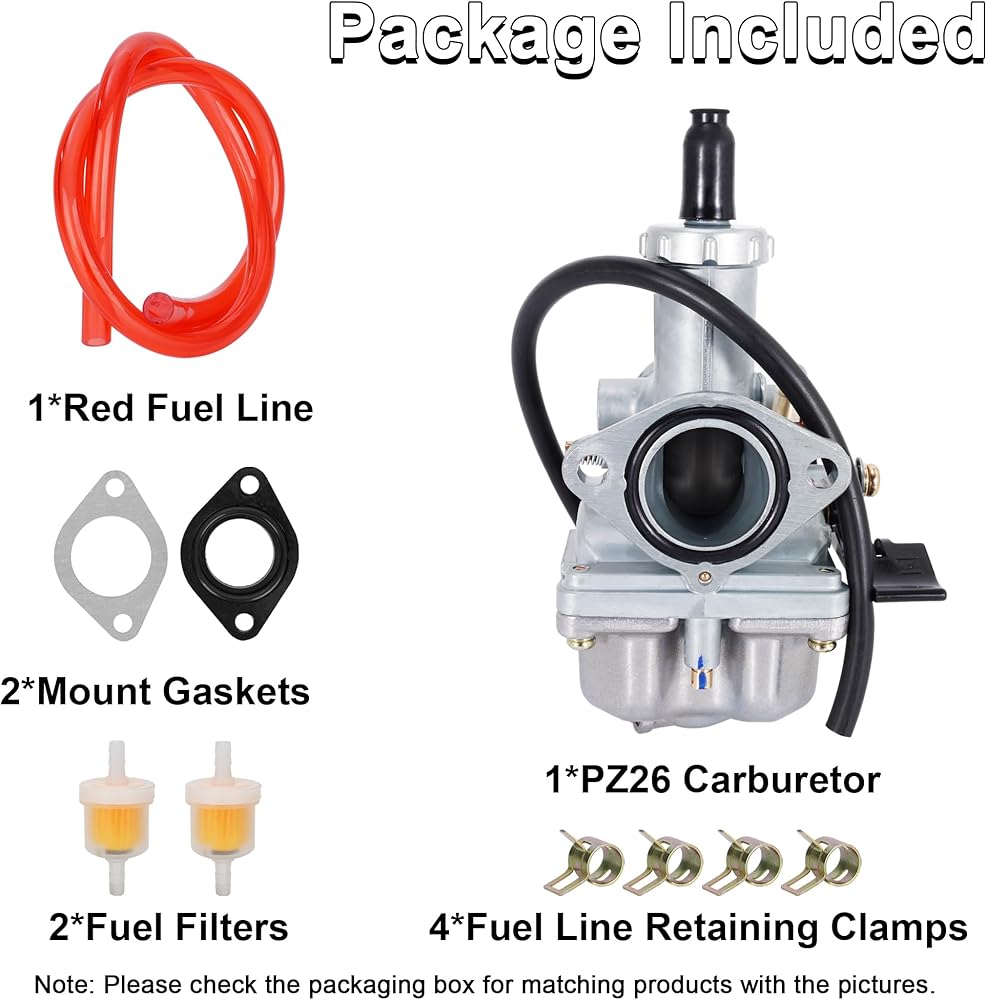 تتضمن العبوة: 1 × مكربن PZ26، 4 × مشابك الاحتفاظ بخط الوقود، 2 × مرشحات الوقود، 2 × حشيات التثبيت، 1 × خط وقود أحمر. يرجى التحقق بعناية قبل الشراء للتأكد من أن المنتج هو ما تحتاجه.
