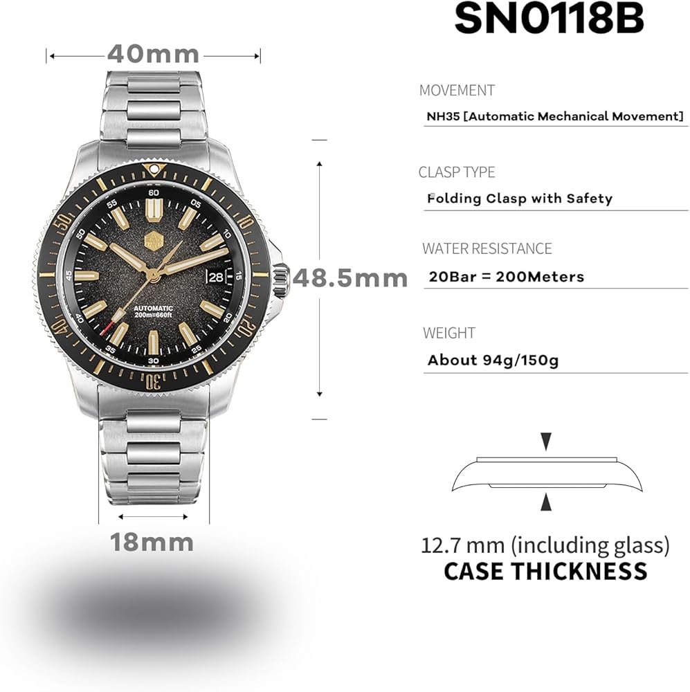 حركة NH35: حركة ميكانيكية أوتوماتيكية NH35 مع قرص عرض تناظري، ساعات غوص للرجال، تردد 21,600 مرة في الساعة (3 هرتز)، جهاز إيقاف ثانٍ، تعبئة أوتوماتيكية ثنائية الاتجاه، حركة ذاتية الملء 24 جوهرة، احتياطي الطاقة يمكن أن يستمر لمدة 41 ساعة