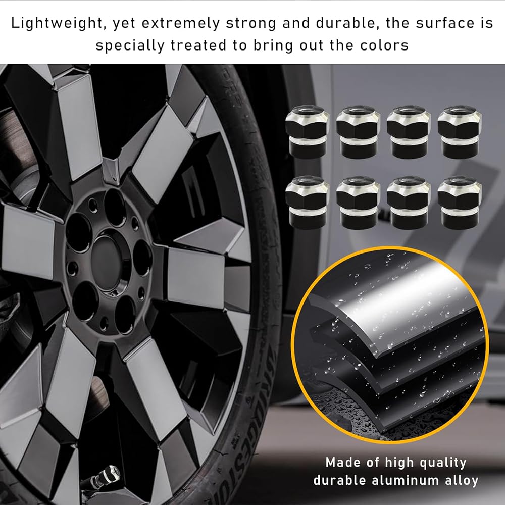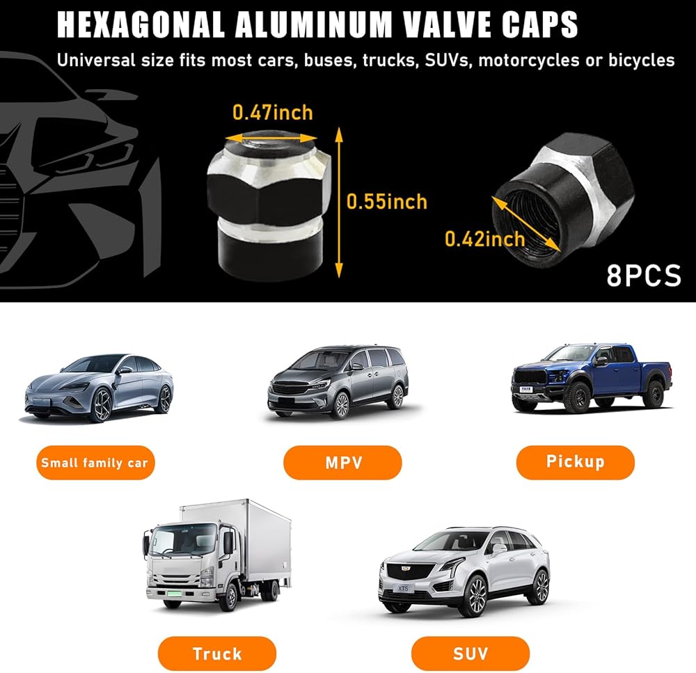 【Wide Application】: The valve cap is designed to fit most vehicles with US style tire valves, such as cars, trucks, SUVs, motorcycles and bicycles. The package contains eight valve caps, enough to meet your needs. It is widely used in cap replacement for home vehicle tire, which is a thoughtful gift for someone close to you who has a car.