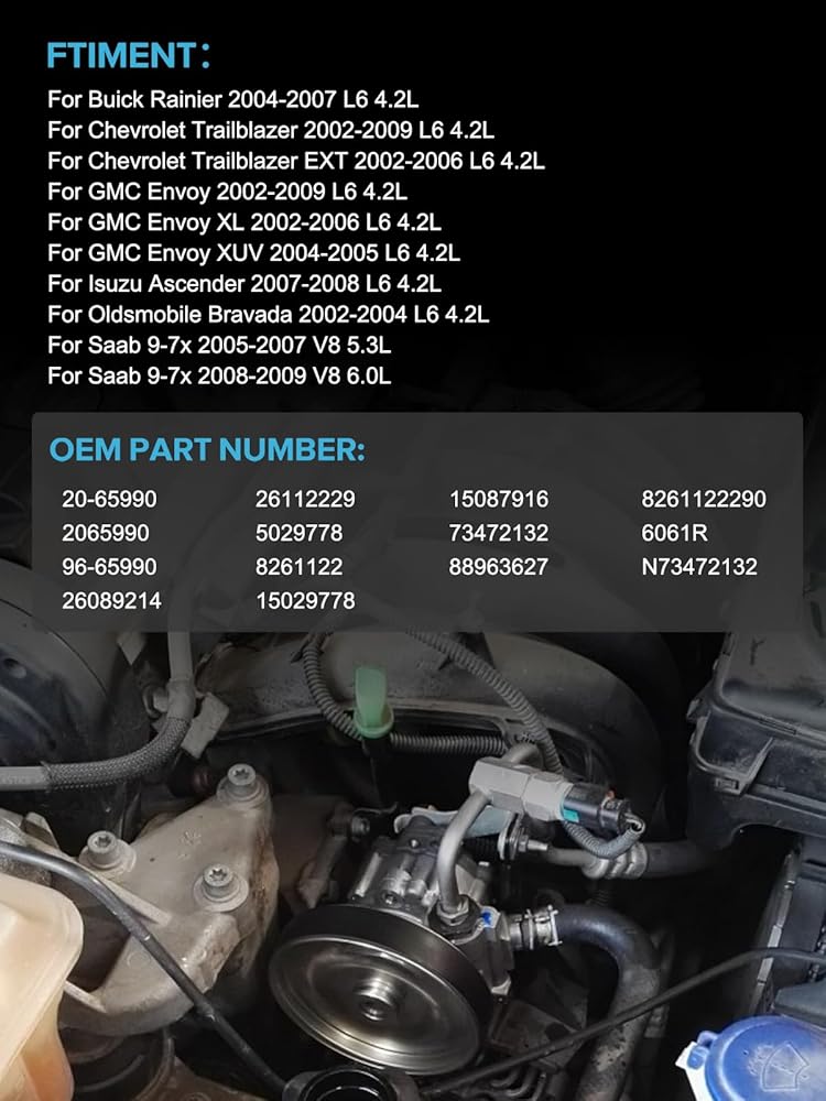- 【الملاءمة】متوافق مع Buick Rainier L6 4.2L 2004-2007، لسيارة شيفروليه تريل بليزر L6 4.2L 2002-2009/Trailblazer EXT L6 4.2L 2002-2006، لسيارة GMC Envoy L6 4.2L 2002-2009/Envoy XL L6 4.2L 2002-2006/Envoy XUV L6 4.2L 2004-2005، لـ Isuzu Ascender L6 4.2L 2007-2008، لـ Oldsmobile Bravada L6 4.2L 2002-2004، لـ Saab 9-7x V8 5.3L 2005-2007 V8 6.0L 2008-2009.