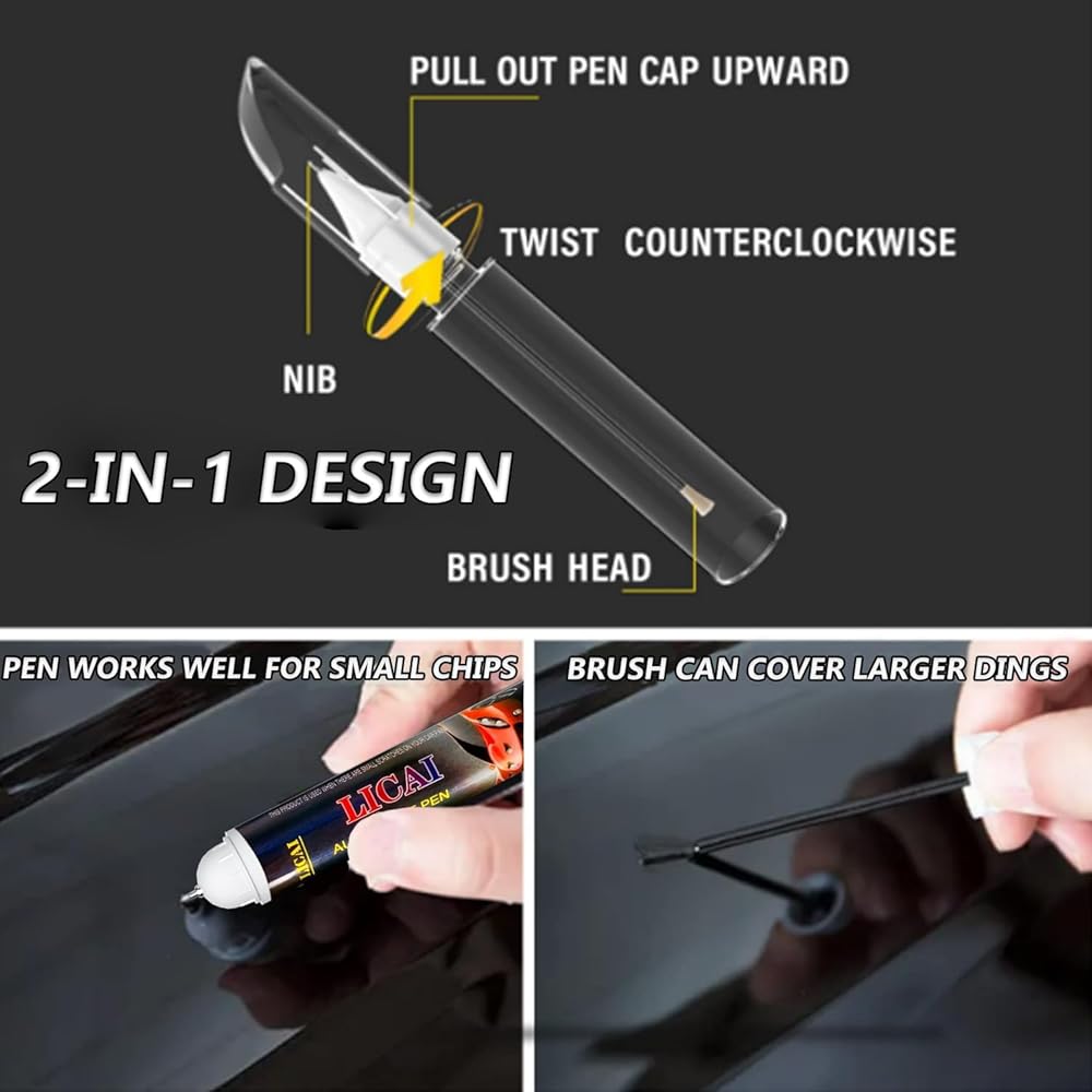 🚚 𝟐-𝐢𝐧-𝟏 𝐃𝐞𝐬𝐢𝐠𝐧 -- Our touch up paint pen is a double-ended design with both a metal tip and a brush, making car paint scratch repair more accurate and easier. The metal nib is for repairing small chips, while the brush is good for those larger or longer scratches.