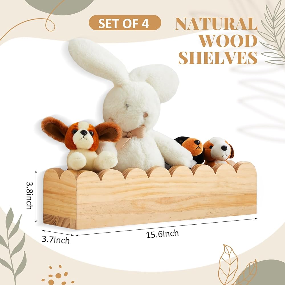 مجموعة Pinkunn من 4 أرفف عائمة صدفية، أرفف صدفية مقاس 15.6 بوصة للحضانة، أرفف كتب الحضانة من الخشب الطبيعي، رف كتب صدفي للأطفال الصغار ديكور جدار غرفة نوم الحضانة