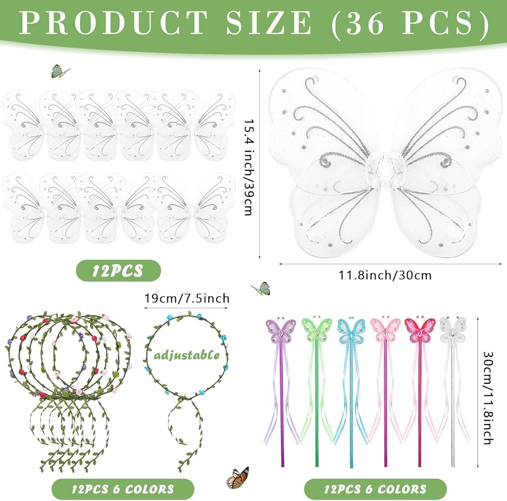 لوازم الديكور: سوف تحصل على 12 جناح فراشة، و12 عصا فراشة من 6 ألوان و12 إكليل من 6 ألوان، بما يكفي لتلبية تفضيلاتك المختلفة واحتياجاتك التزيينية، يمكنها أن تجعلك لطيفًا وحيويًا