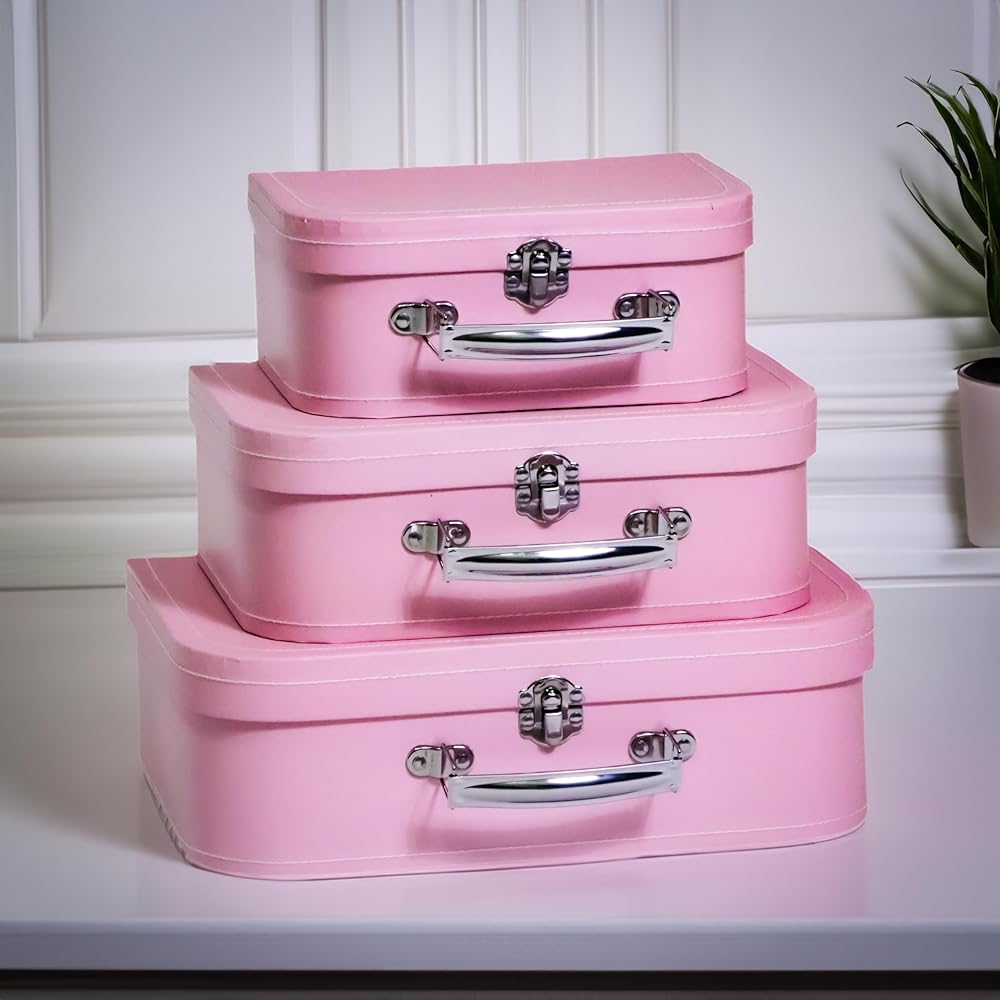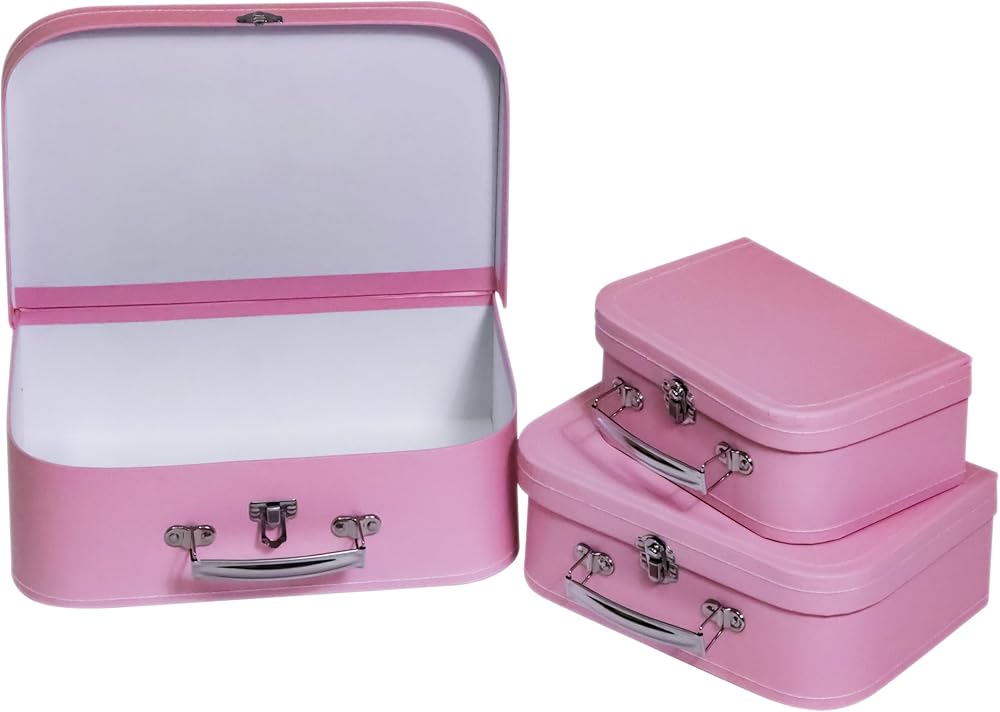 Made of heavy duty cardboard with silver metal clasp and handle, the pink cases are perfect as a travel party prop or for a pretty pink bedroom