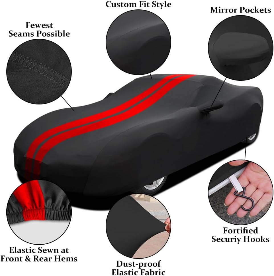 خطافات الأمان: مجهزة بخطافات أمان معززة لها تأثير تثبيت جيد. تحيط الحاشية المرنة بالجزء السفلي من غطاء السيارة لحماية غطاء سيارتك من الانفجار.