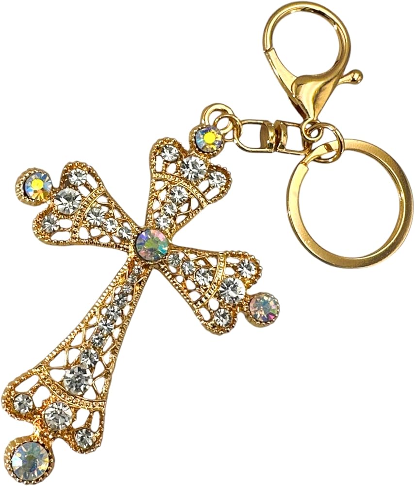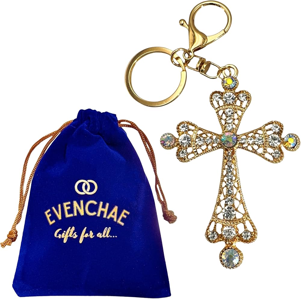 Unite faith and fashion with the captivating Evenchae Bejeweled Cross Keychain. This gold-tone accessory features a classic cross design adorned with sparkling crystals or faux-pearls and intricate filigree for a timeless Christian aesthetic.