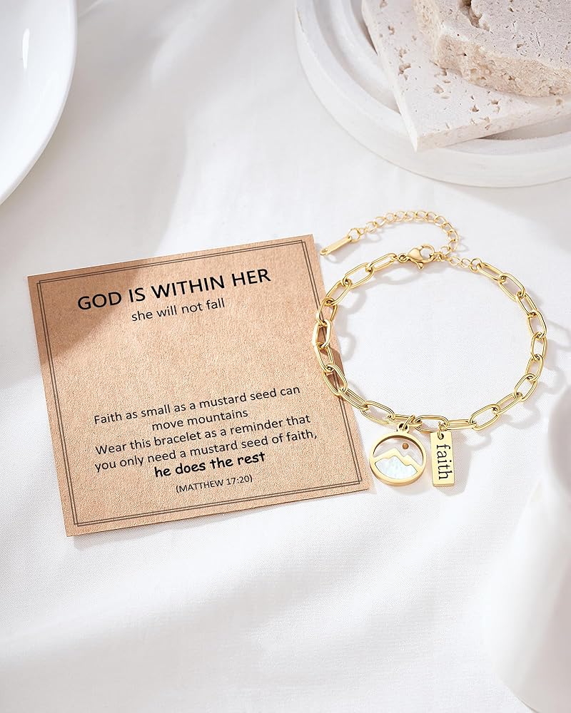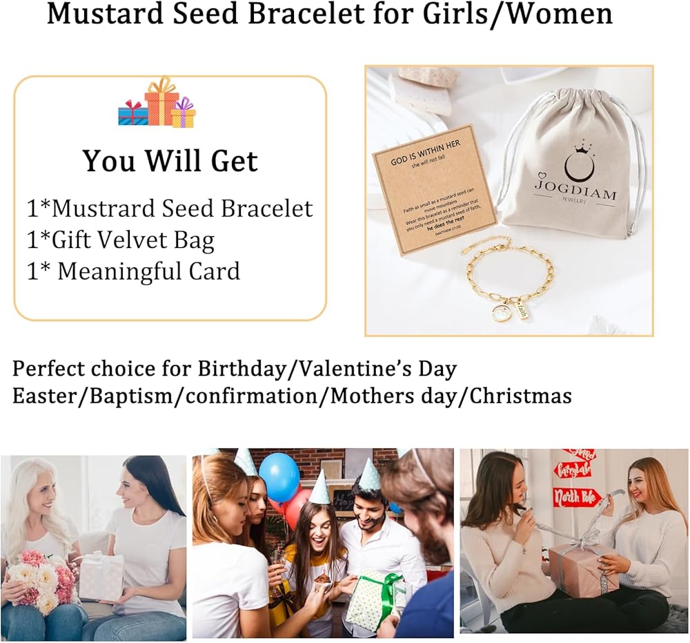 أفكار هدايا مسيحية - يأتي سوار بذور الخردل الخاص بنا مغلفًا بشكل جميل مع حقيبة هدايا مخملية وبطاقة ذات معنى. إنه خيار ممتاز كهدية مسيحية، سواء كانت لأمك أو جدتك أو ابنة أختك أو صديقك المفضل.