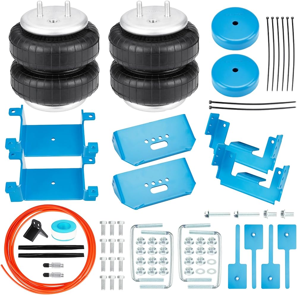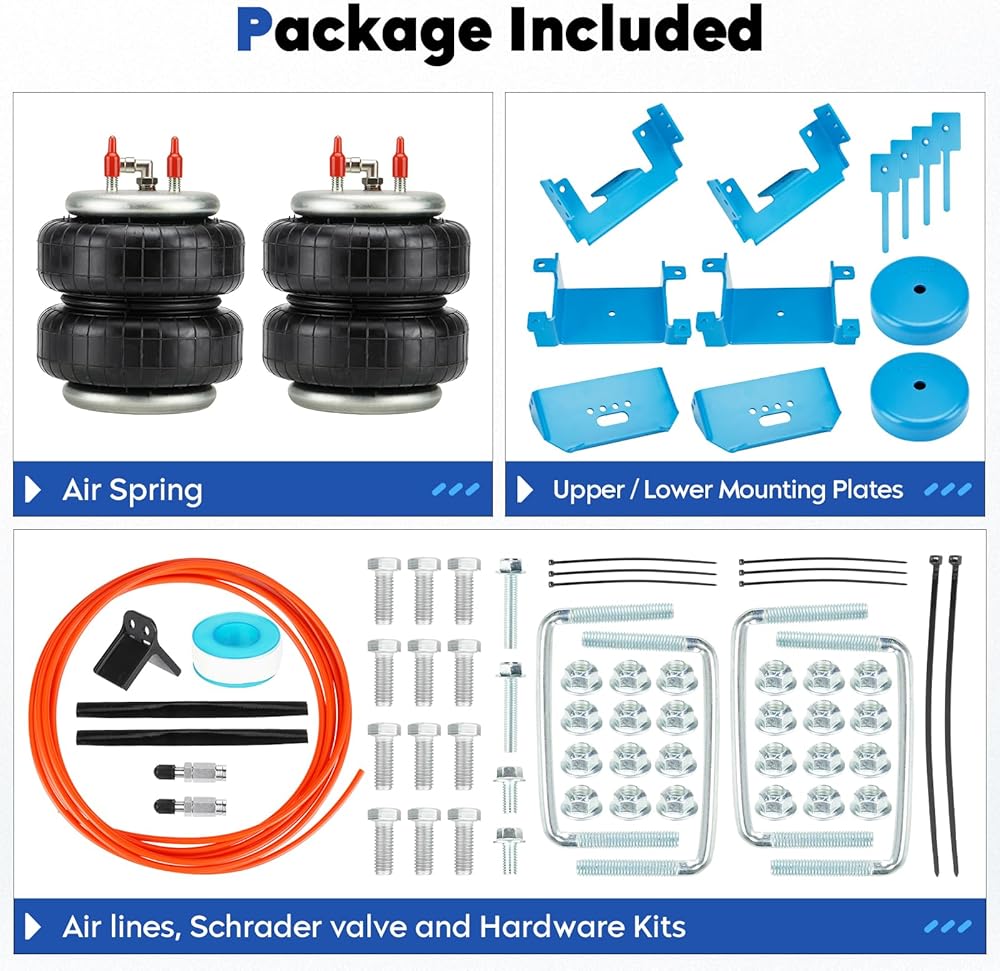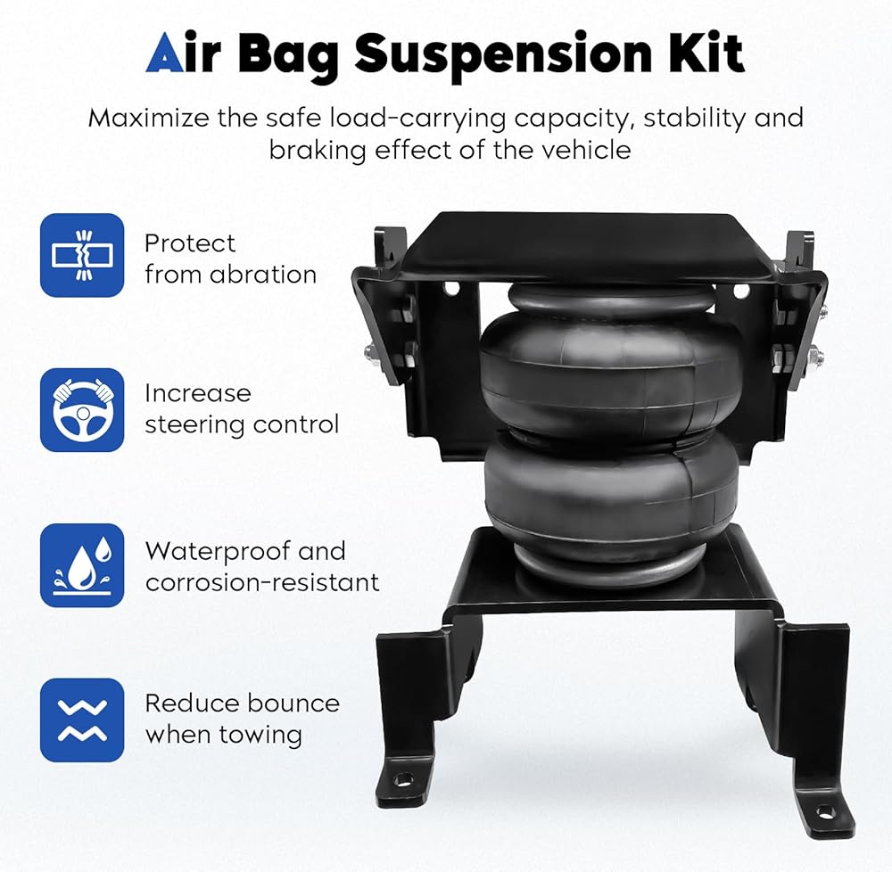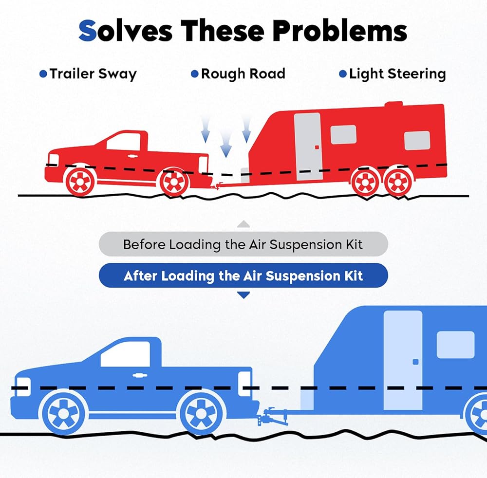 【Prevents Unbalanced Loads】Our air helper springs can bear up to 5000 pounds. It prevents vehicle unbalanced loads, protects cargo, protects tires, and keeps headlights level.