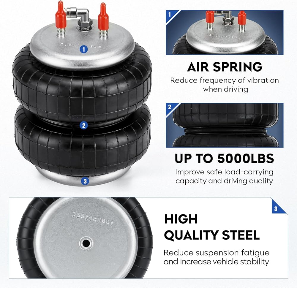 Load Leveling Capacity: Our air helper springs provide load support through air pressure. It can be adjusted for changing loadss, and can bear up to 5000 pounds.