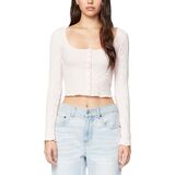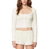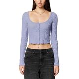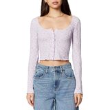 Soft sleep microthermal button front long sleeve sweater cardigan in Soft Millie Lavender Garden Floral print. Features baby button front and scoop neckline. Imported fabric; 58% BCI Cotton, 39% Recycled Polyester, 3% Spandex. 210 GSM.