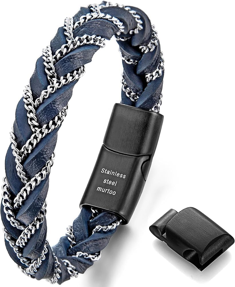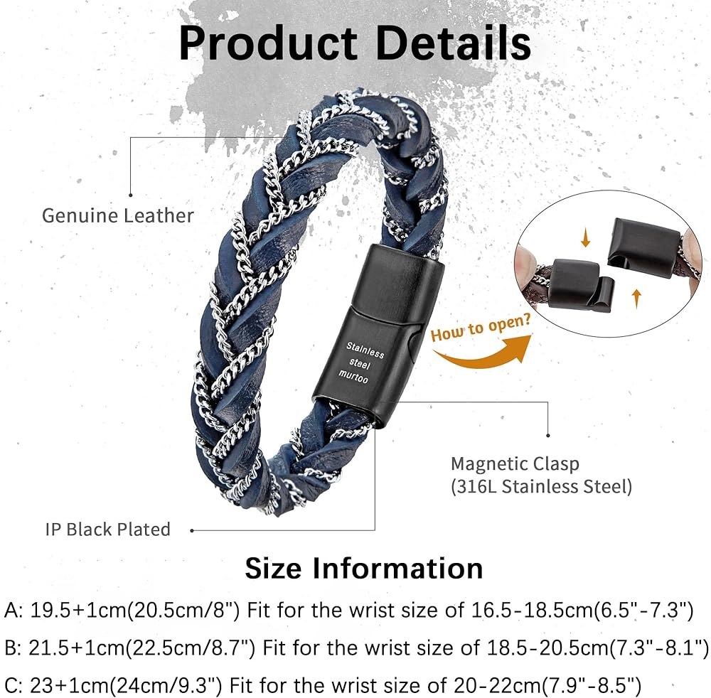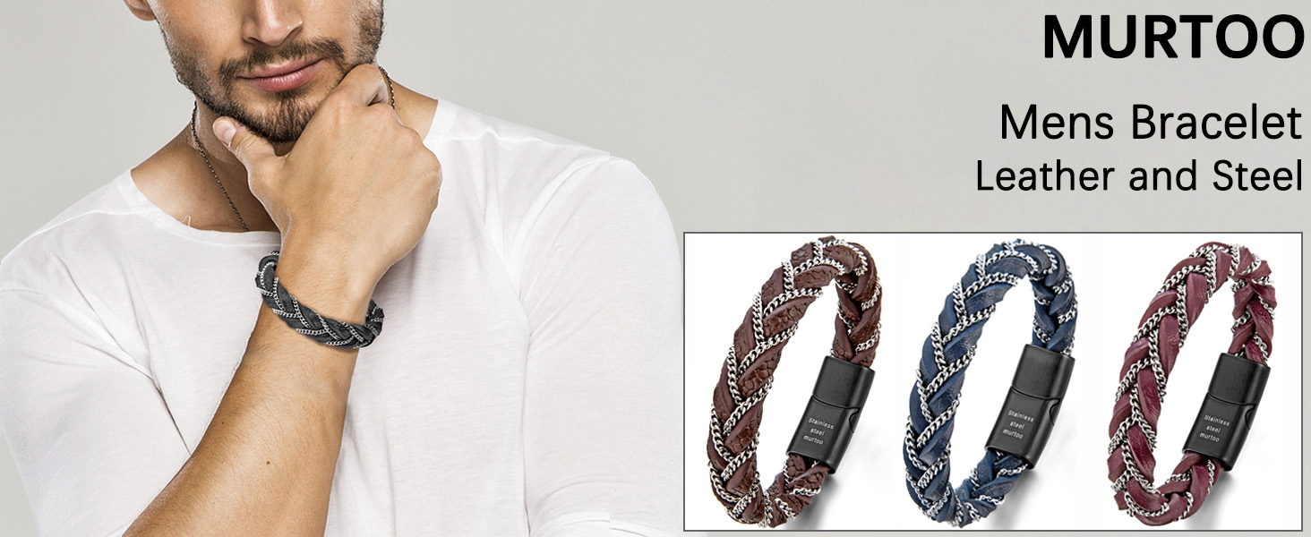 أفكار للهدايا: إذا كنت تبحث عن سوار جديد، فإن سوار Murtoo الرجالي المصنوع من الجلد مع سلسلة فولاذية هو خيار رائع. إنها هدية مثالية لنفسك أو عائلتك أو عشاقك أو أصدقائك في أعياد الميلاد، أو التخرج، أو الذكرى السنوية، أو عيد الحب، أو عيد الأب، أو عيد الشكر، أو الكريسماس... زينة معصم عصرية يجب أن يمتلكها الرجال